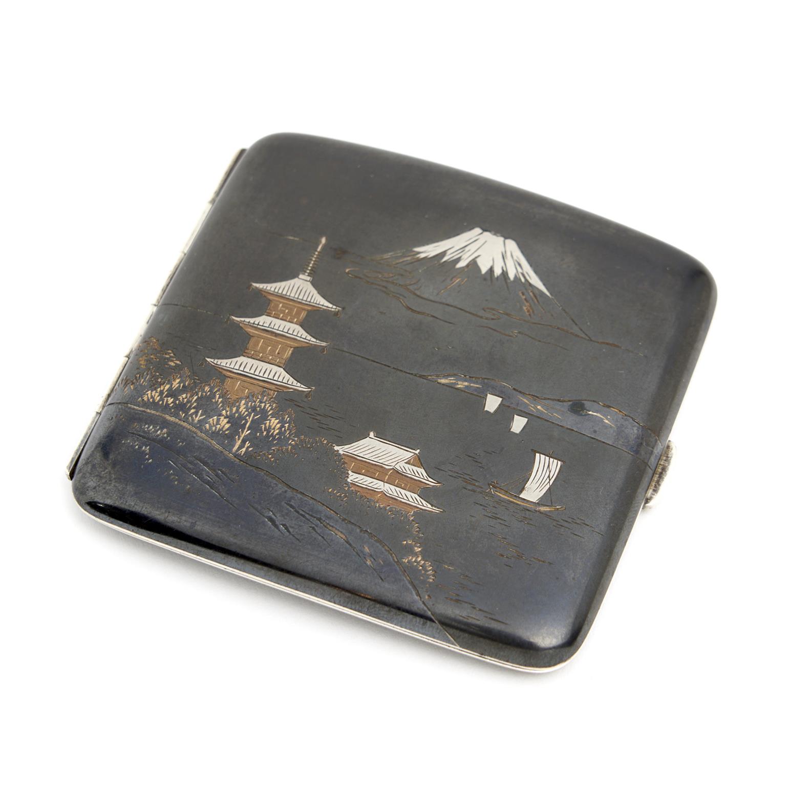 A 1940S JAPANESE STERLING SILVER KOMAI CIGARETTE CASE WITH MOUNT FUJI AND PAGODAS TO THE FOREGROUND W.8.5CM, LEONARD JOEL DELIVERY SIZE: SMALL