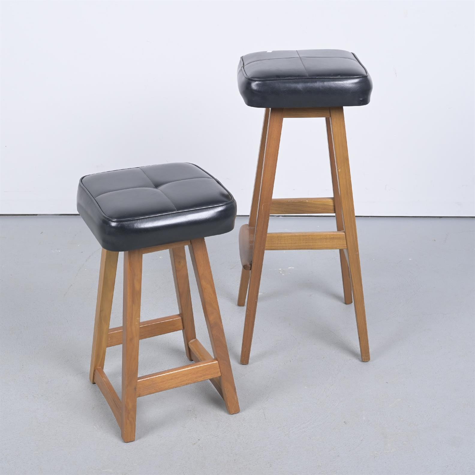 TWO 1970's TEAK AND BLACK VINYL STOOLS (76H X 35W X 35D CM) (LEONARD JOEL DELIVERY SIZE: LARGE)