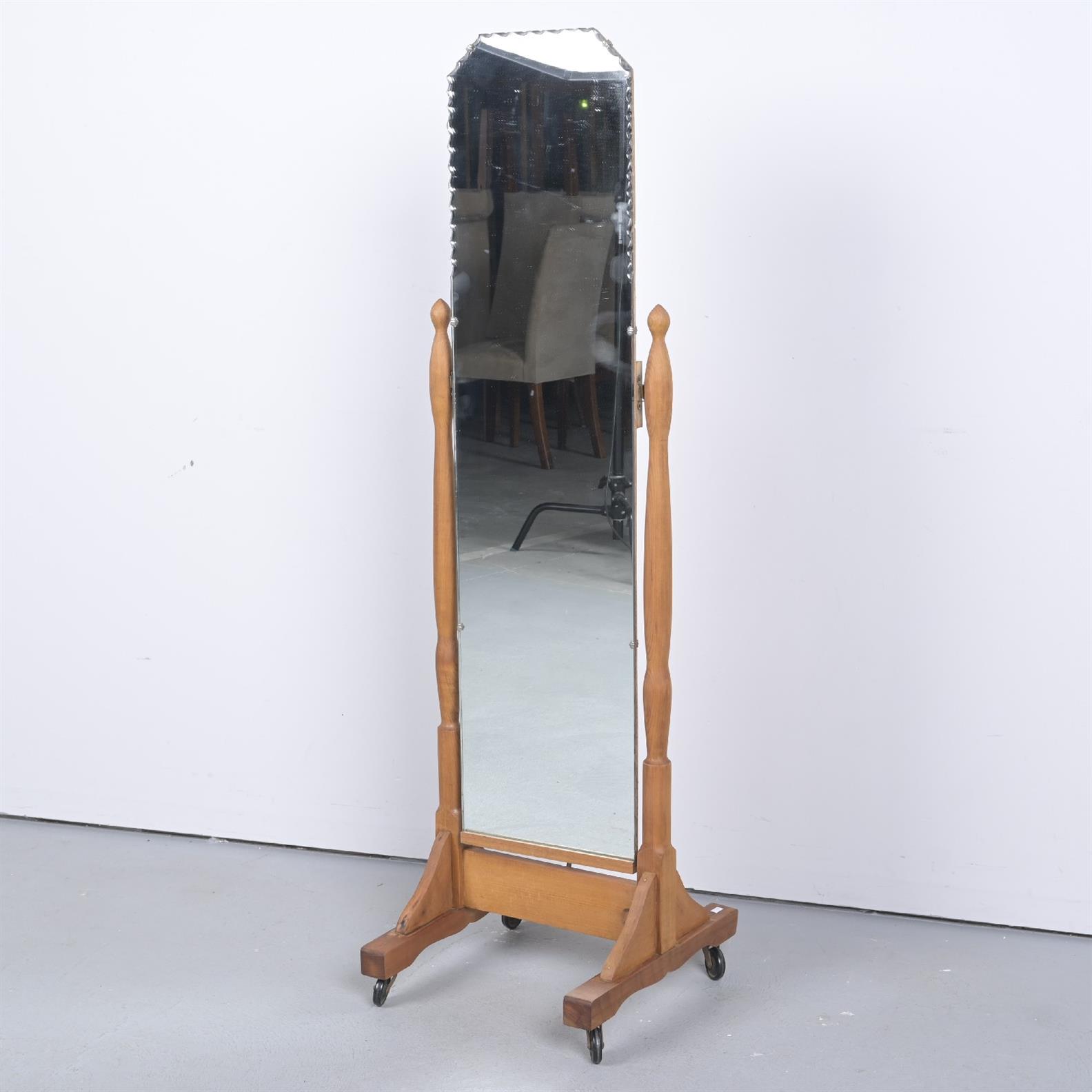 A 1940s SCALLOPED-EDGE CHEVAL MIRROR, ON CASTORS (145H X 42W X 45D CM) (LEONARD JOEL DELIVERY SIZE: LARGE)
