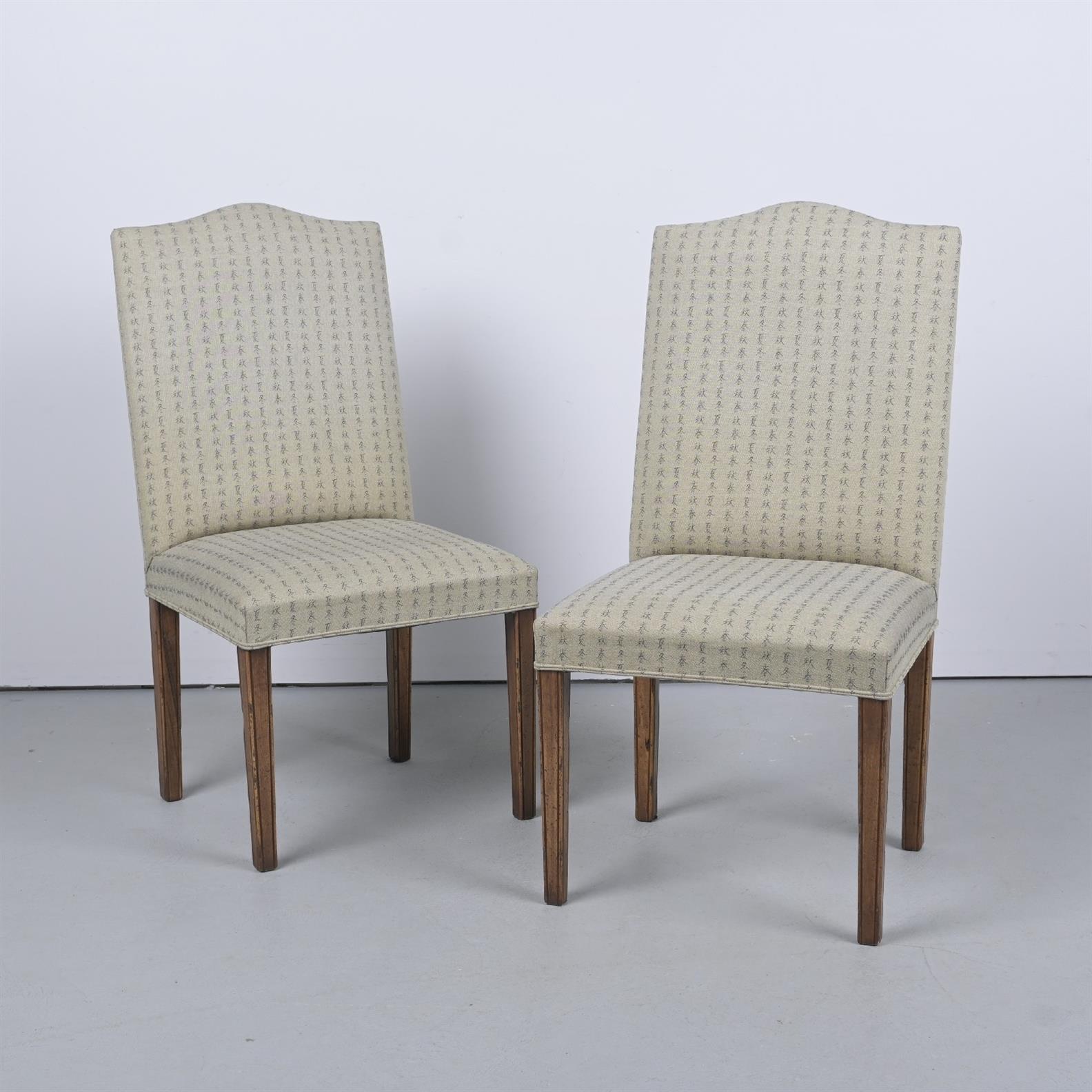 A PAIR OF CHAMFERED LEG DINING CHAIRS UPHOLSTERED IN CHINESE FABRIC (110H X 55W X 68D CM) (LEONARD JOEL DELIVERY SIZE: LARGE)