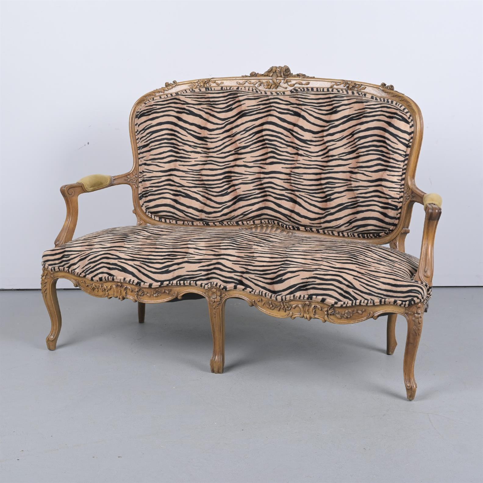 A LOUIS XV-STYLE BEECH-FRAMED SOFA, UPHOLSTERED IN TIGER PRINT FABRIC (110H X 150W X 60D CM) (LEONARD JOEL DELIVERY SIZE: X-LARGE)