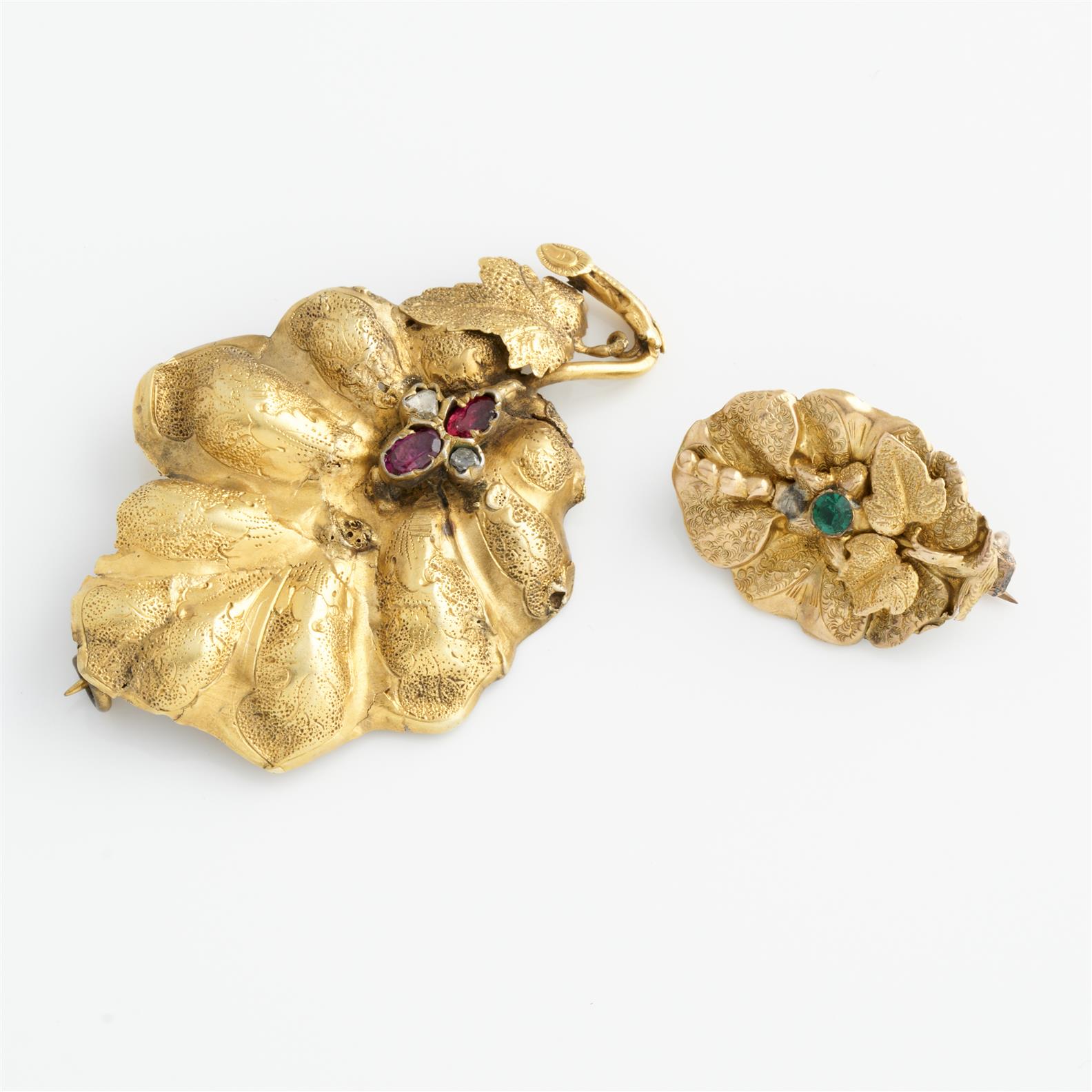 A PAIR OF GEM SET BROOCHES IN 14CT AND LOW CARAT GOLD, THE LARGER MEASURING 53 X 35MM, 11.3GMS