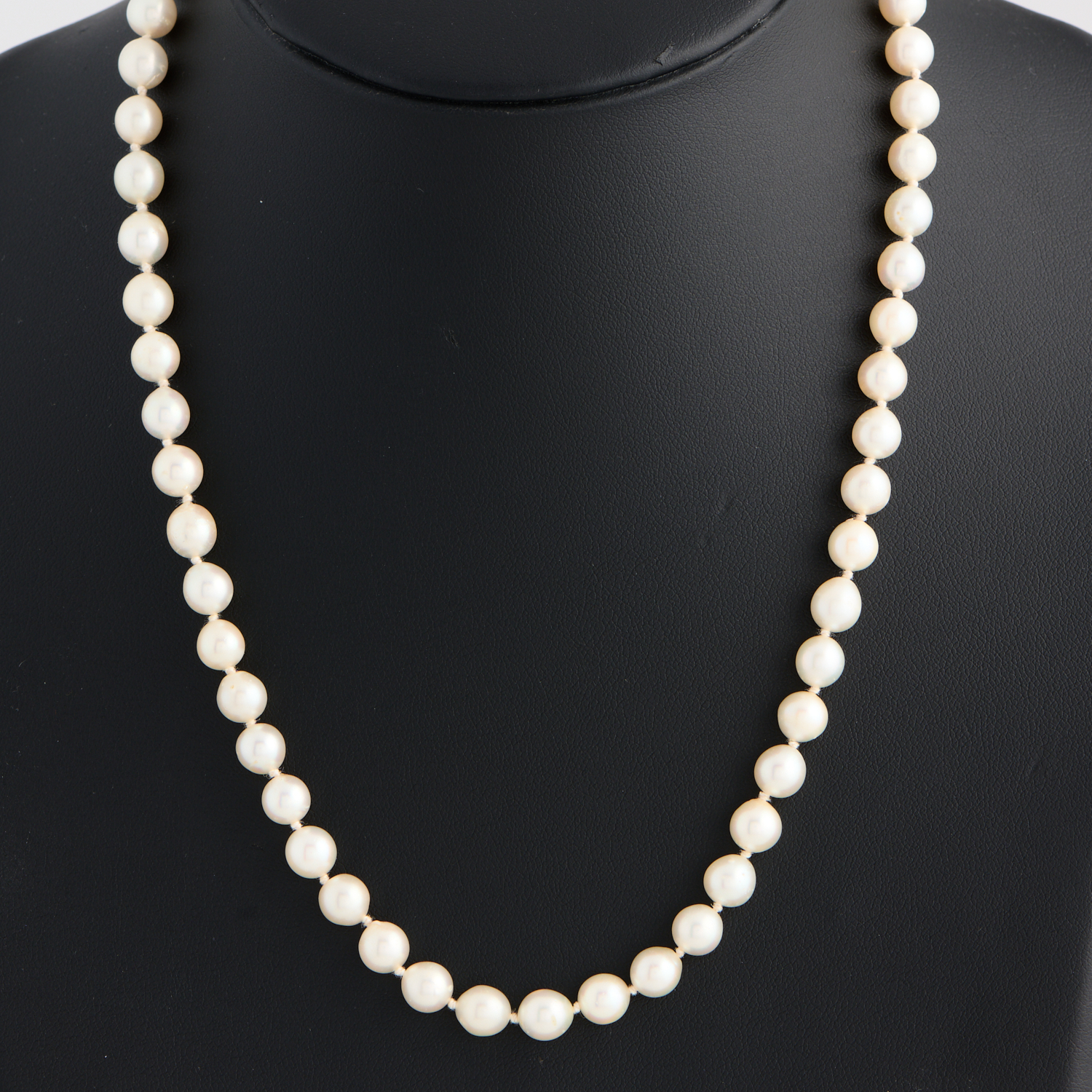 A STRAND OF AKOYA PEARLS TO A CLASP IN 9CT GOLD, THE PEARLS MEASURING APPROXIMATELY 6.5 - 7.0MM, 480MM