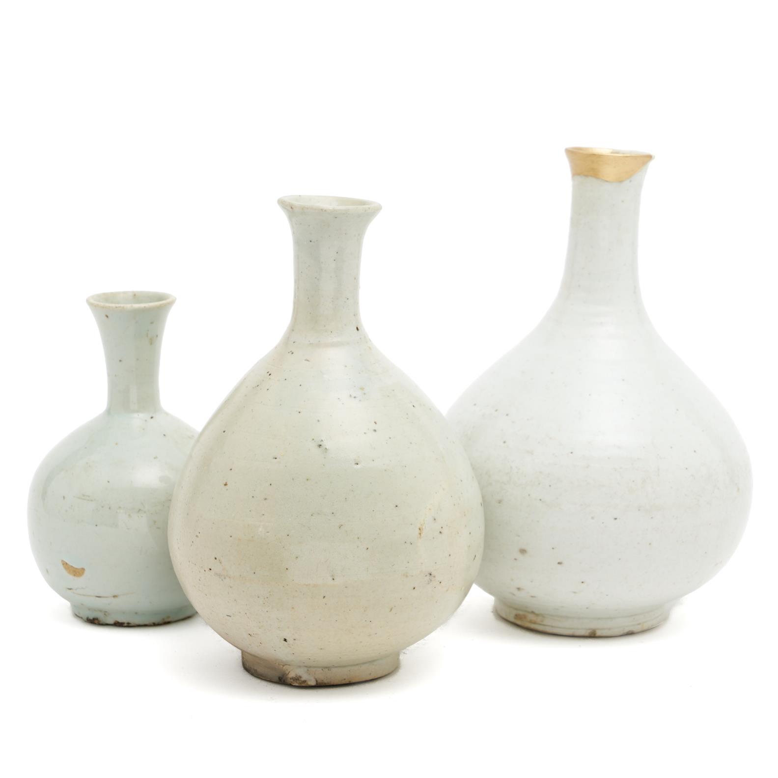 A GROUP OF THREE KOREAN WHITE GLAZED CERAMIC BOTTLE VASES H.25CM (TALLEST), LEONARD JOEL DELIVERY SIZE: LARGE