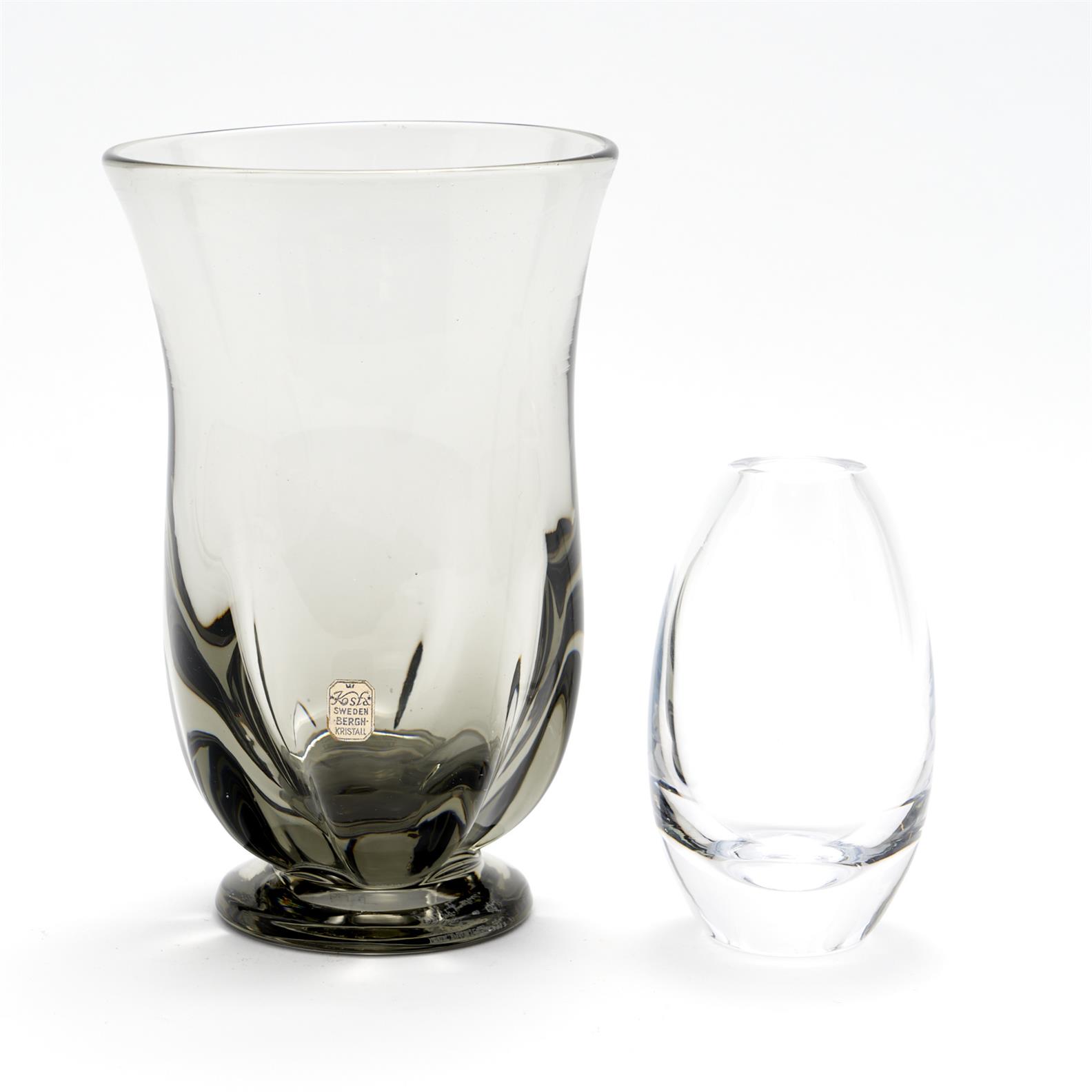 A SWEDISH 1936 KOSTA VASE BY ELIS BERGH WITH ORIGINAL LABEL WITH ANOTHER VASE POSSIBLY BY STROMBERG H.27 CM (TALLEST), LEONARD JOEL DELIVERY SIZE: MEDIUM