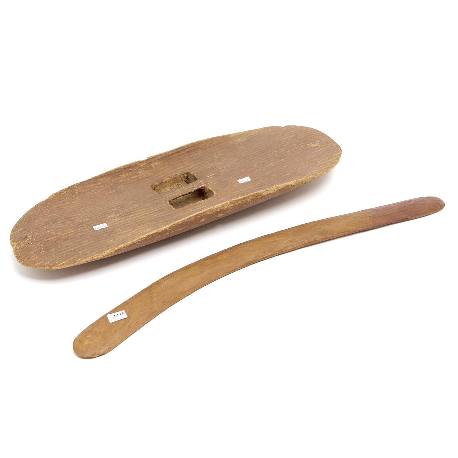 A FINELY FLUTED CENTRAL AUSTRALIAN ABORIGINAL BEAN WOOD SHIELD (62 CM) WITH EARTH PIGMENT AND A STONE CUT BOOMERANG L.68CM WITH TRACES OF OCHRE, LEONARD JOEL DELIVERY SIZE: MEDIUM