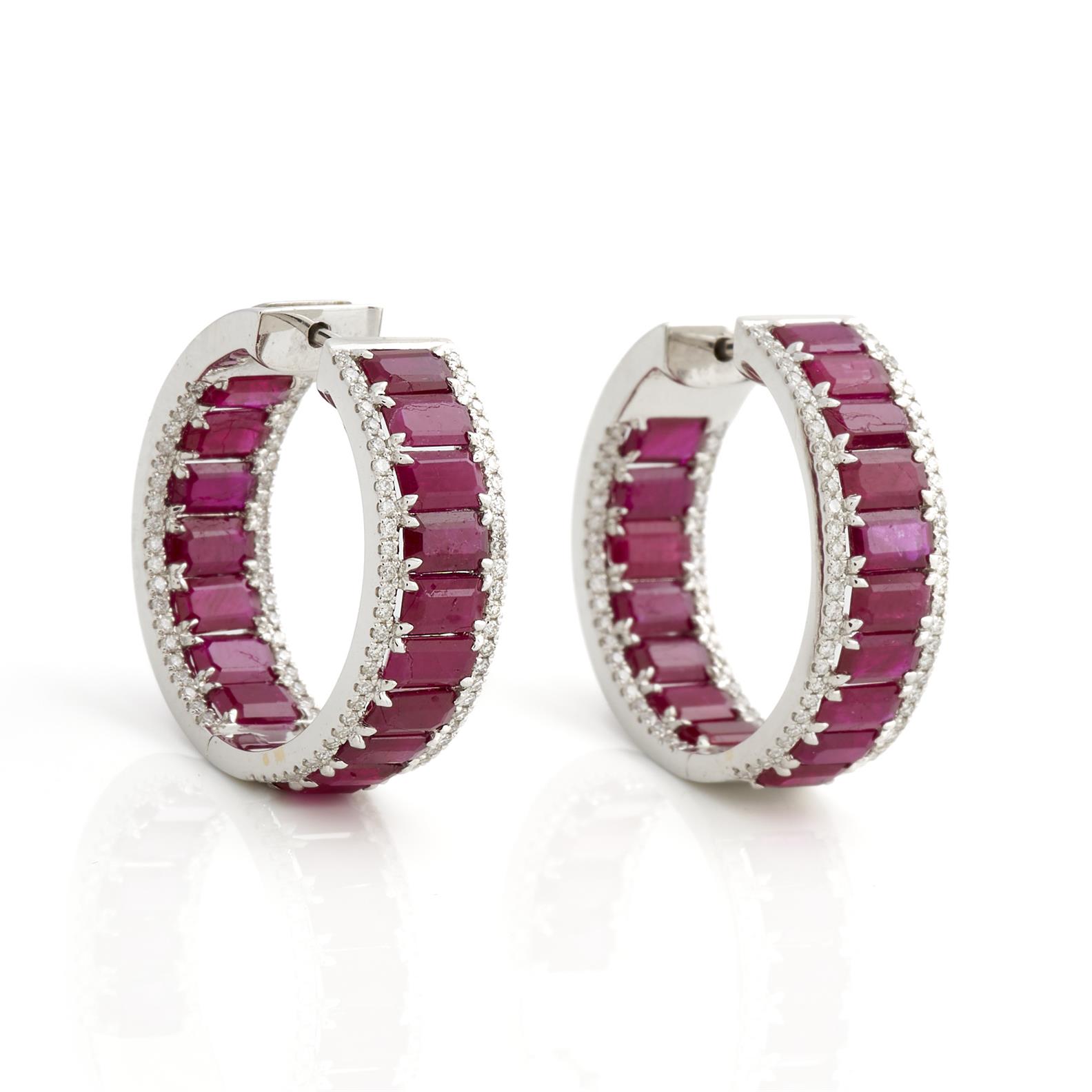 A PAIR OF RUBY AND DIAMOND HOOP EARRINGS IN 14CT WHITE GOLD, THE RUBIES TOTALLING 10.4CT, THE DIAMONDS TOTALLING 0.80CTS, TO POST FITTINGS, LENGTH 25MM, 12.8GMS