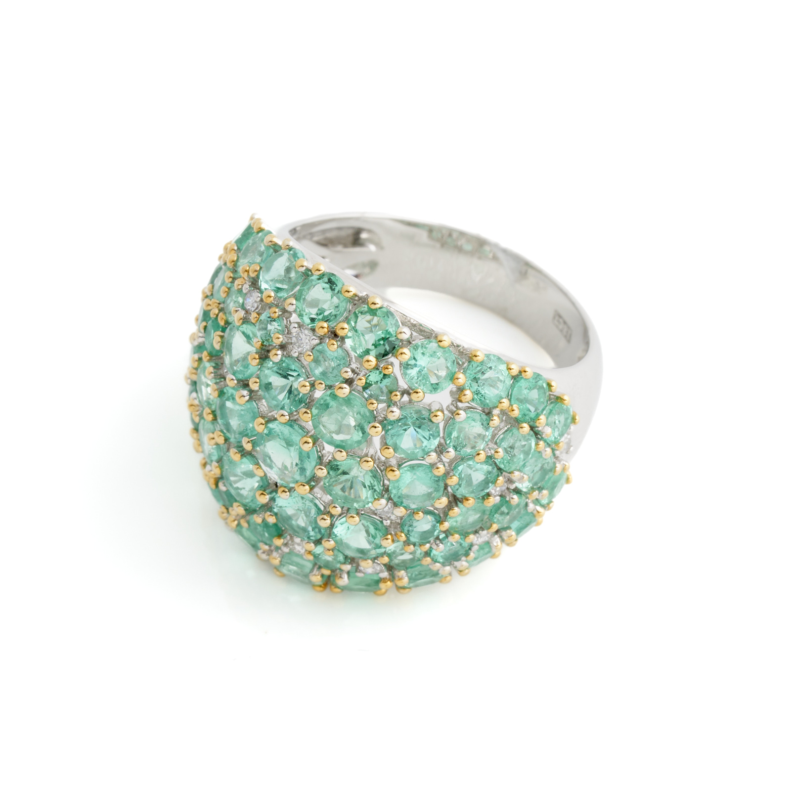 A COLOMBIAN EMERALD AND DIAMOND RING IN 18CT TWO-TONE GOLD, THE EMERALDS TOTALLING APPROXIMATELY 4.72CTS, THE DIAMONDS TOTALLING APPROXIMATELY 0.26CTS, SIZE O, 14.4GMS