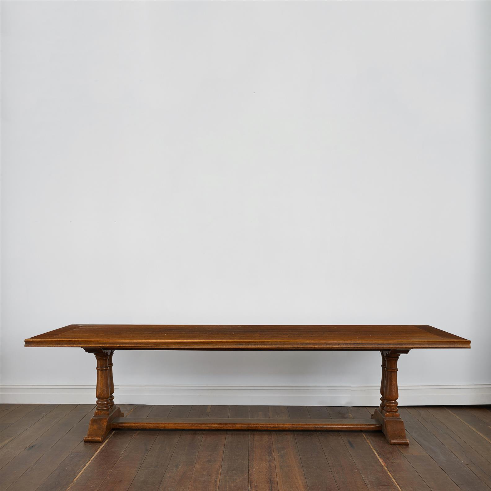 AN OAK REFECTORY TABLE IN THE 17TH CENTURY SPANISH STYLE THE CLEATED PLANK TOP ON TURNED TRESTLE SUPPORTS UNITED BY WROUGHT IRON STRETCHERS