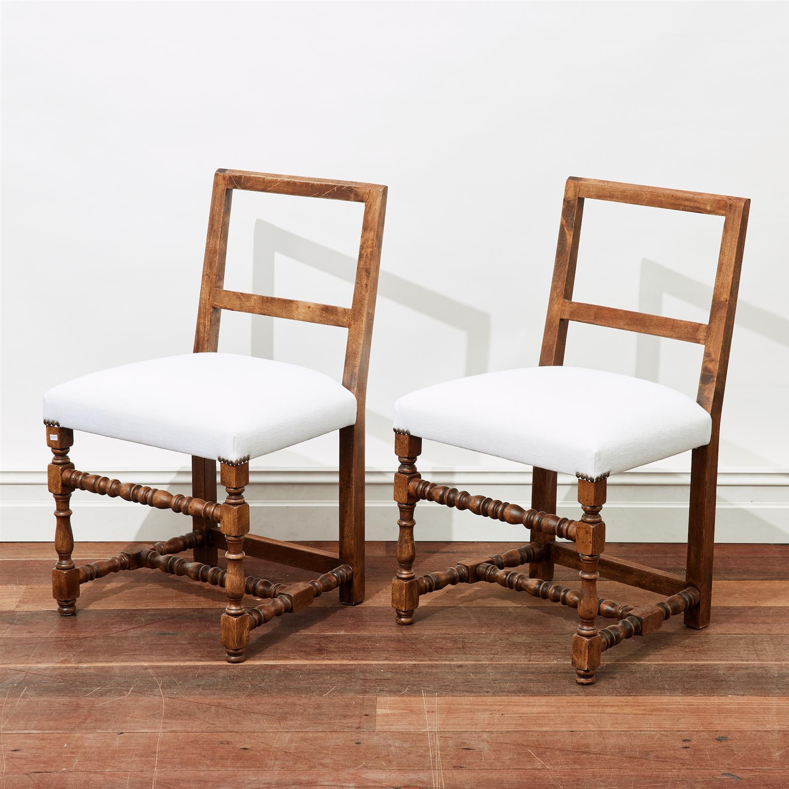 A PAIR OF CHARLES II STYLE DINING CHAIRS WITH SQUARE BACKS, TURNED LEGS AND STRETCHERS (2)