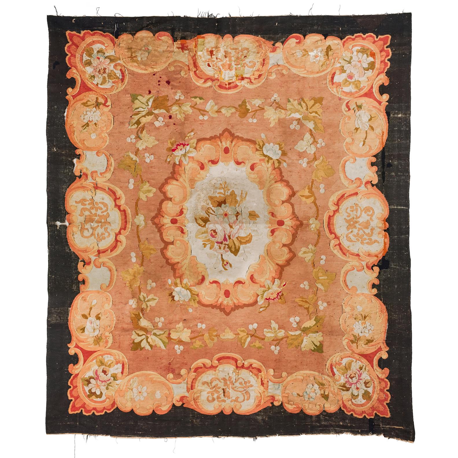 A NAPOLEON III AUBUSSON CARPET WITH CENTRAL FLOWER MEDALLION ON PINK FIELD AND FLORAL BORDER AND BLACK EDGE
