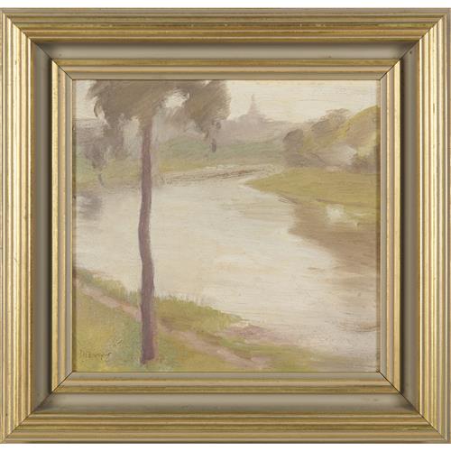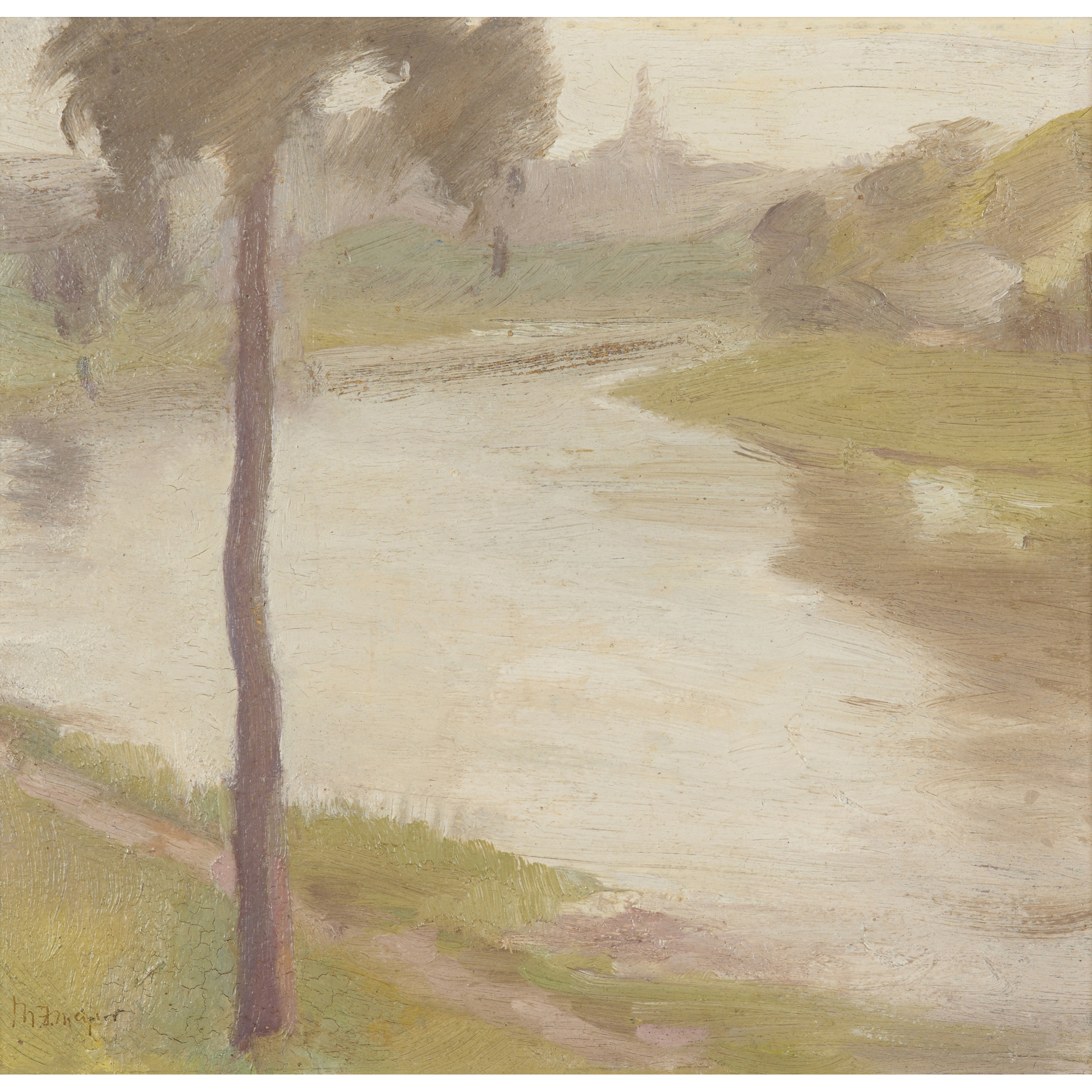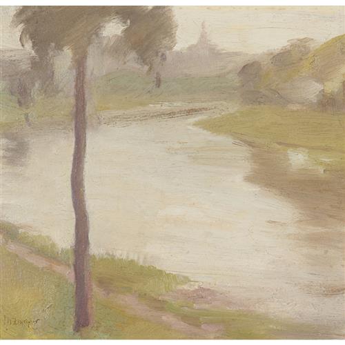 CLARICE BECKETT (1887-1935) Soft Evening Study for Princes Bridge c.1930 (verso) oil on board, double-sided 20.5 x 20.5cm