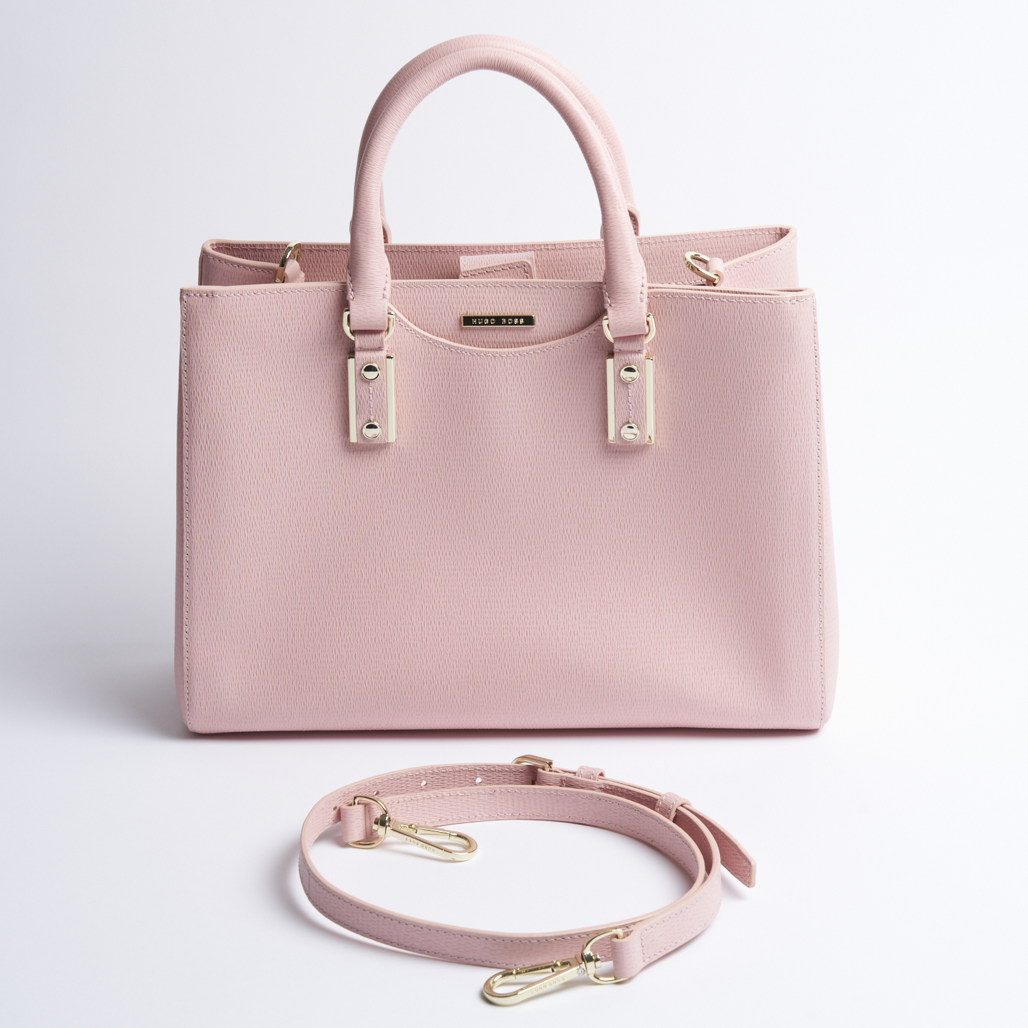 HUGO BOSS, A TOP HANDLE BAG STYLED IN PINK COATED CANVAS, FEATURING REMOVABLE/ADJUSTABLE SHOULDER STRAP AND GOLD TONE HARDWARE, 26 X 36 X 15CM