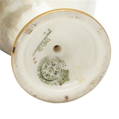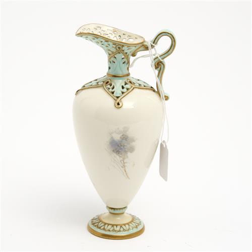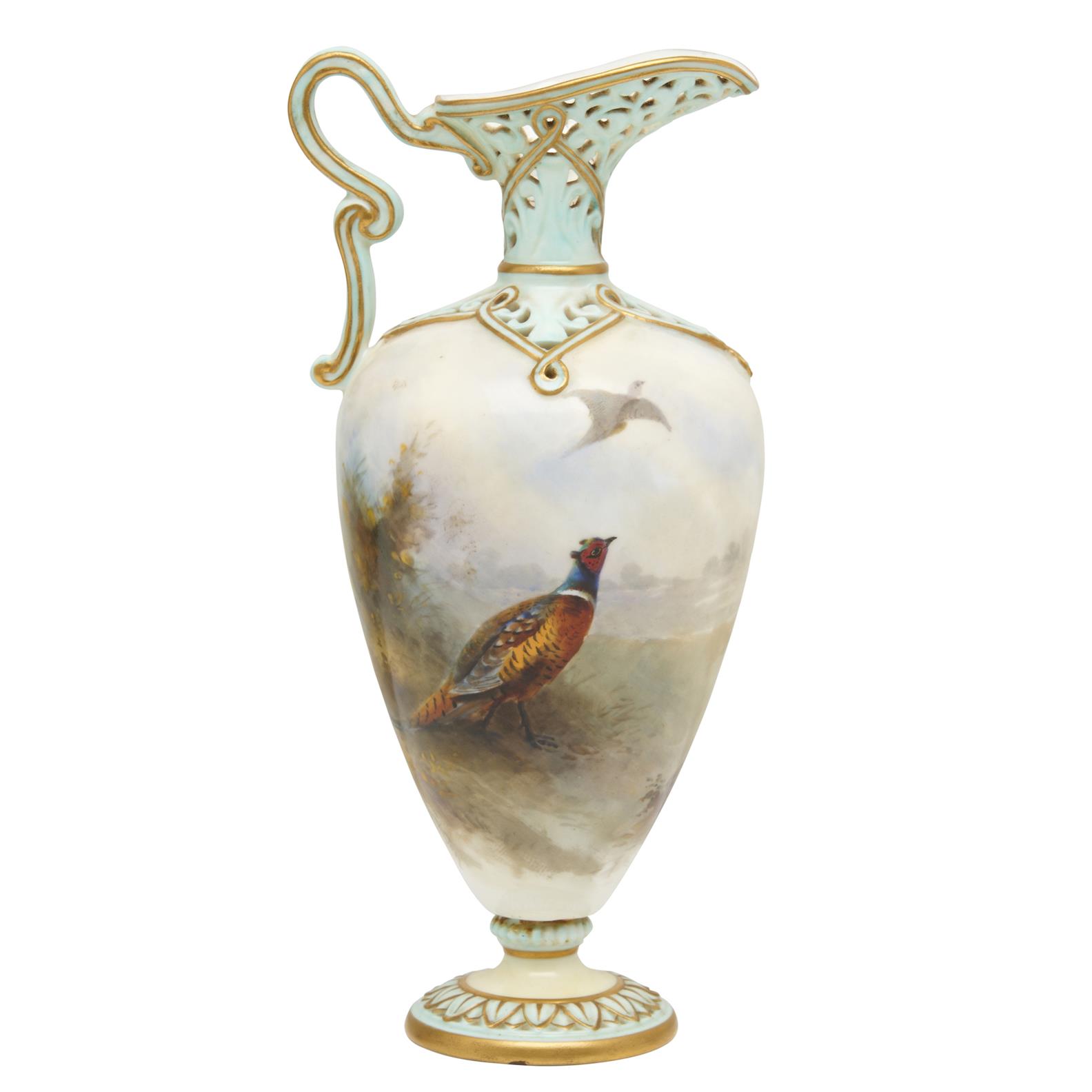 A ROYAL WORCESTER PORCELAIN EWER, DECORATED BY JAMES STINTON (A/F, REPAIR TO BASE AND HAIRLINE)