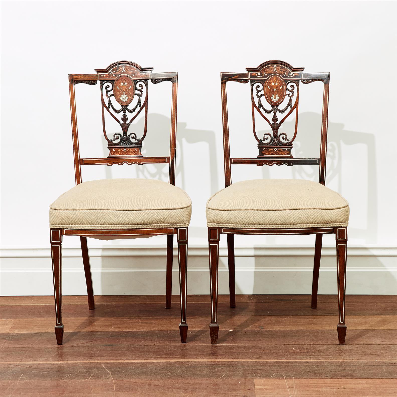 Each with overall wear, some losses to inlay and minor repairs consistent with age and use, one seat with a patch of abrasion to upholstery.