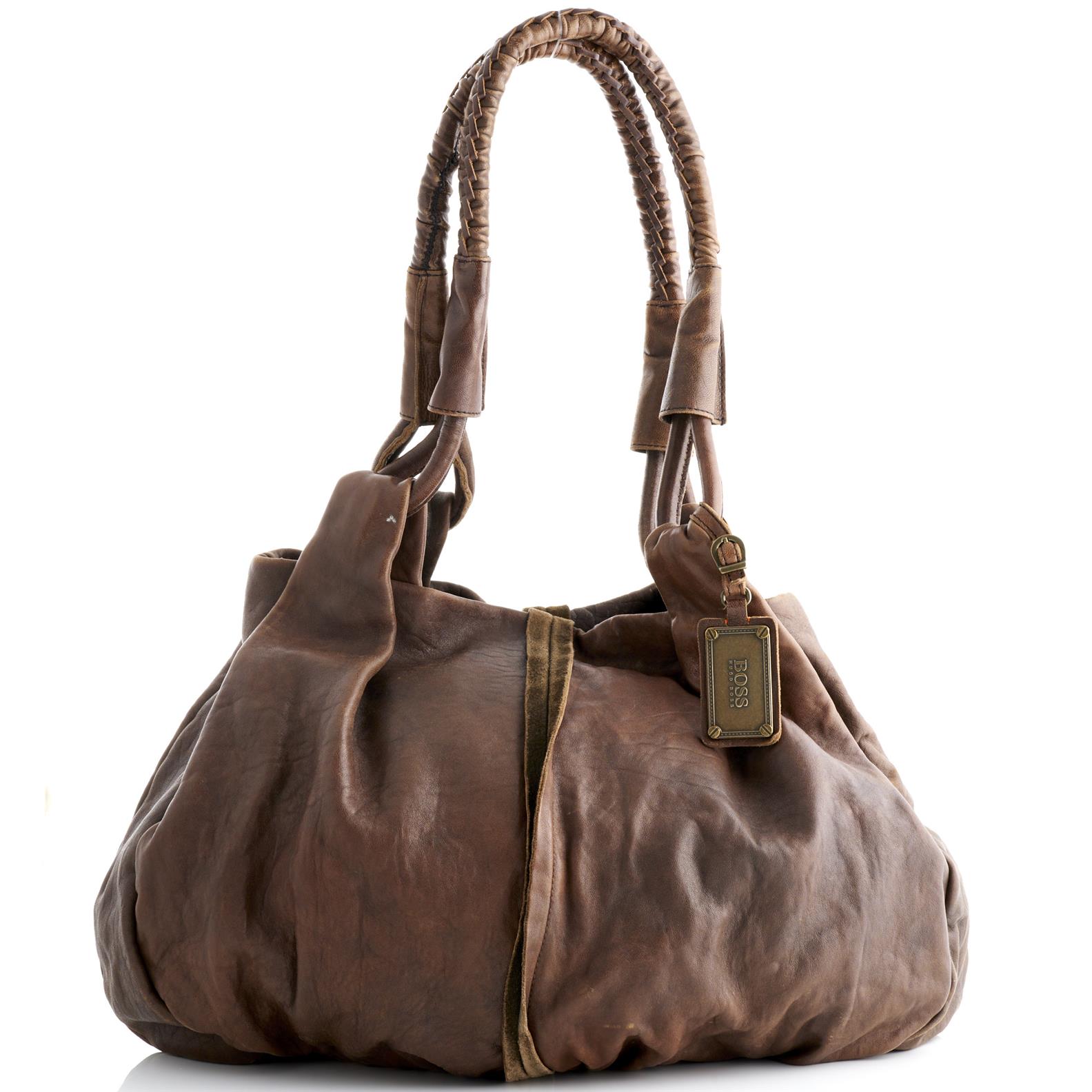 HUGO BOSS, A HOBO BAG STYLED IN TAN LEATHER, FEATURING BRAIDED LEATHER HANDLES AND BRONZE TONE HARDWARE, 35 X 35 X 12CM
