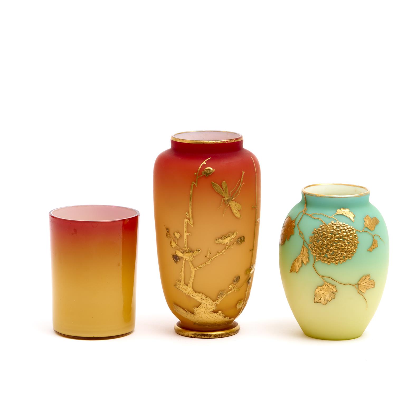 A PEACH BLOW 'DRAGONFLY' VASE, ATTRIBUTED TO THOMAS WEBB TOGETHER WITH A CASED YELLOW AND BLUE VASE, ATTRIBUTED TO THOMAS WEBB AND A WHEELING USA THUMBLER WHITE LINER (A/F SMALL CHIP) H.15.5CM (TALLEST), LEONARD JOEL DELIVERY SIZE: MEDIUM