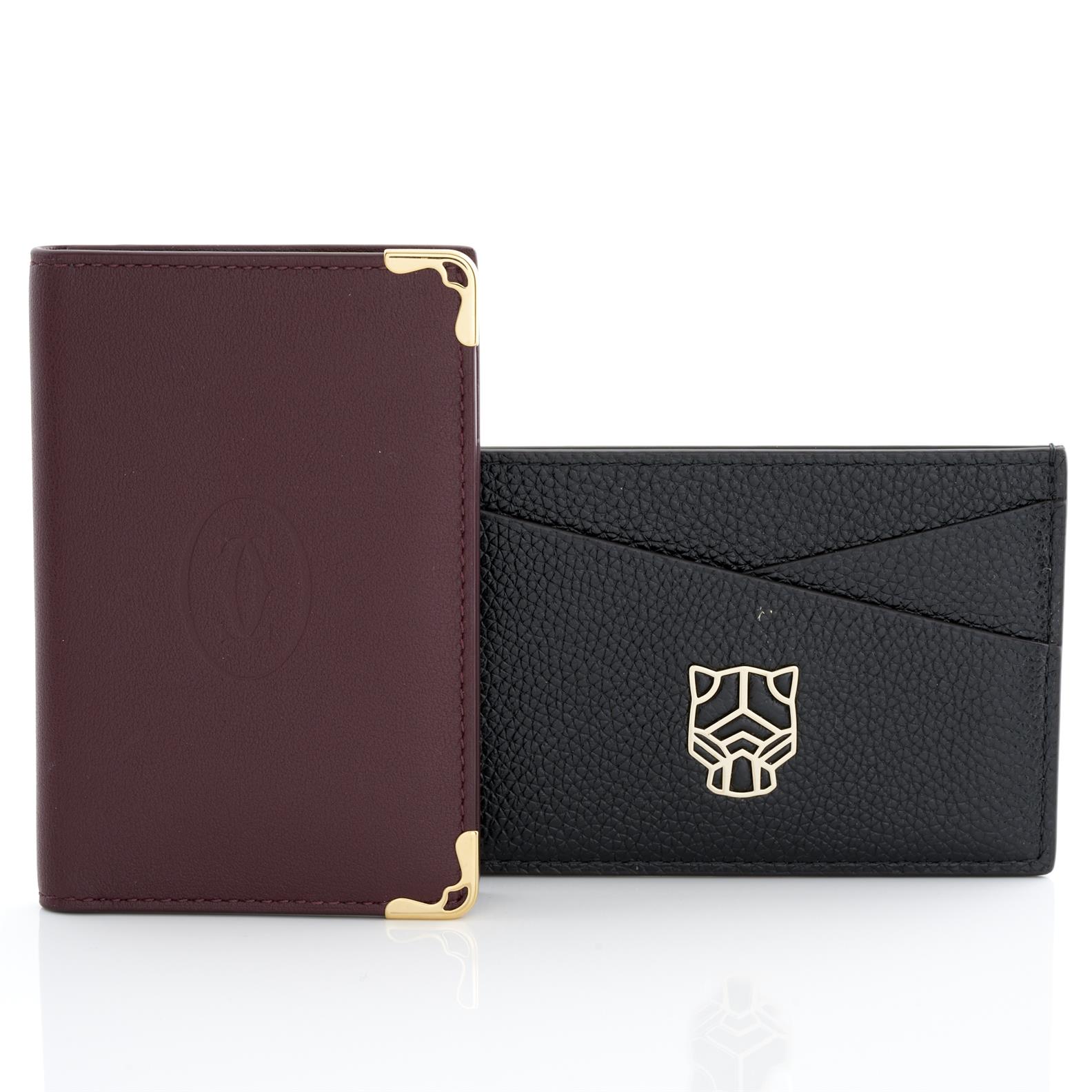 CARTIER, A PAIR OF CARD WALLETS, ONE STYLED IN BLACK LEATHER WITH SILVER TONE DETAIL, THE OTHER STYLED IN MAROON LEATHER EITH GOLD TONE DETAIL, EACH MEASURING APPROXIMATELY 7.5 X 11 X 1CM