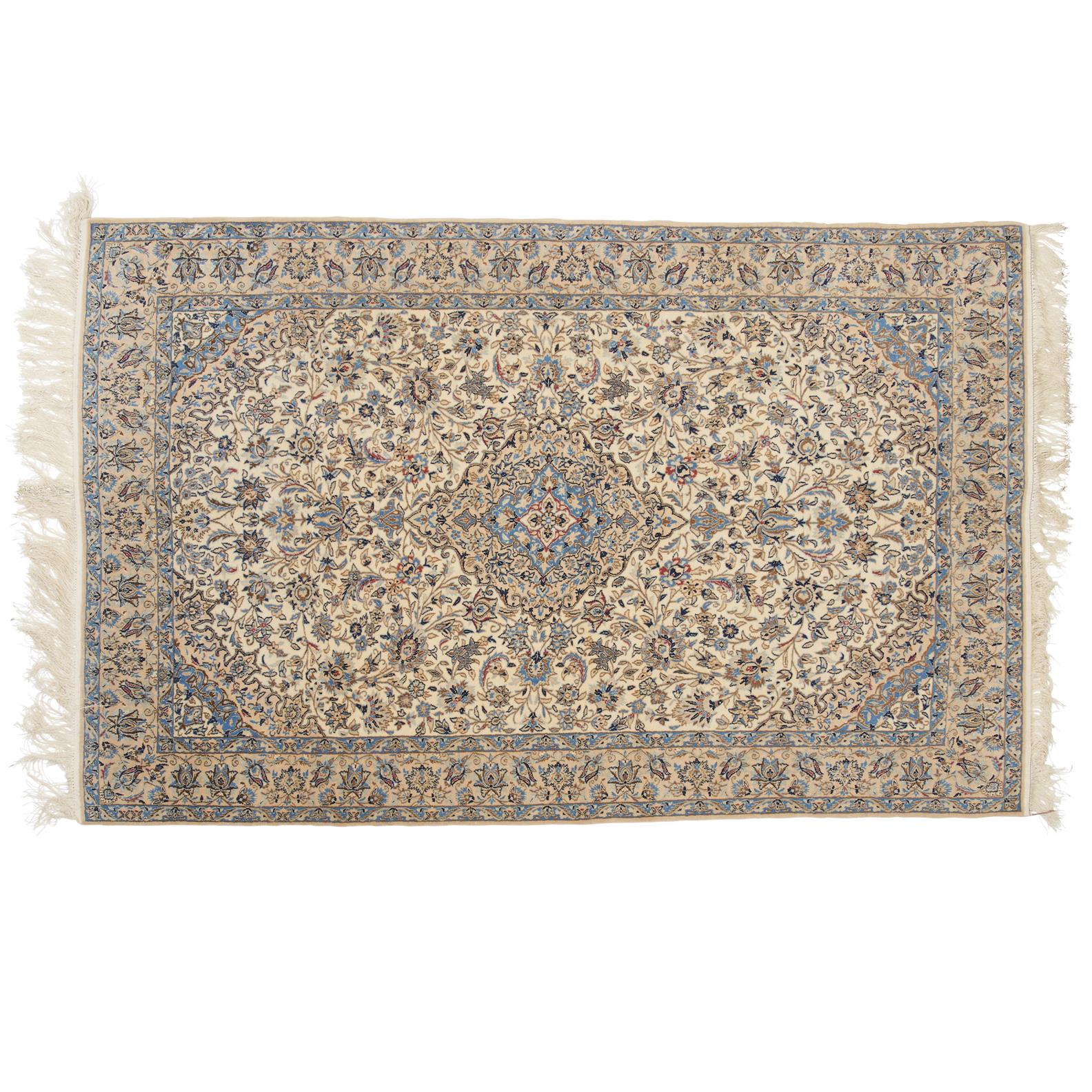 The whole in blues, browns, and other colours on a cream ground, the field with a small shaped floral medallion within an all-over design of flowering foliage, the border of floral designs