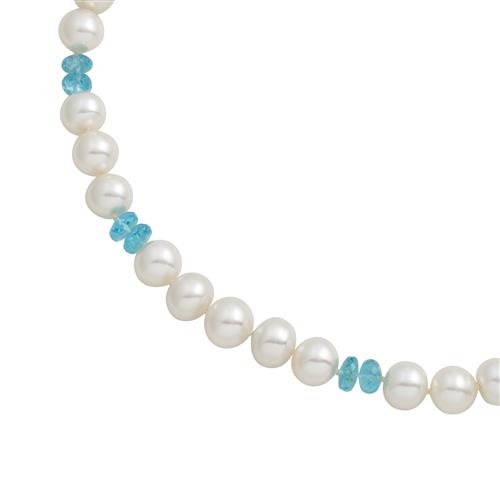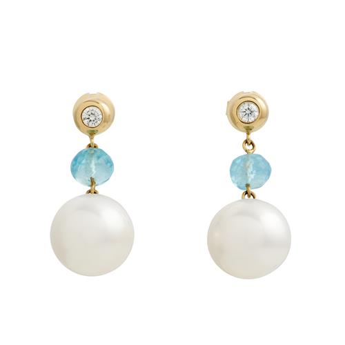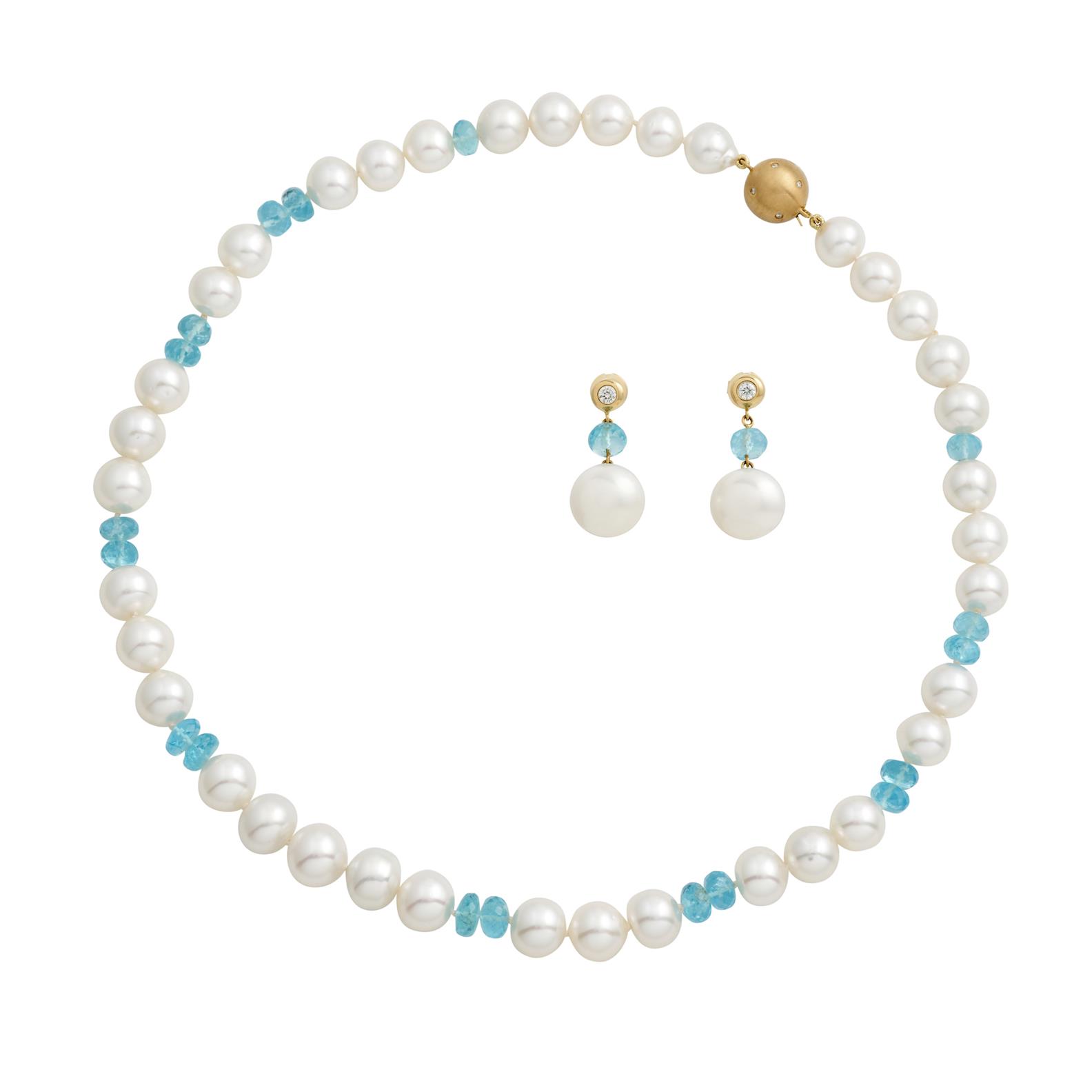 Consisting of a strand of thirty-seven white button shaped south sea pearls measuring 9.60 -11.5mm interspersed at measured intervals with sky-blue natural faceted apatite rondelles strung with knots to an brushed finish yellow gold and diamond set ball clasp. The earrings ensuite consisting of a domed bezel set diamond from which are suspended an apatite rondelle and a singular semi-round white south sea pearl of 11mm.