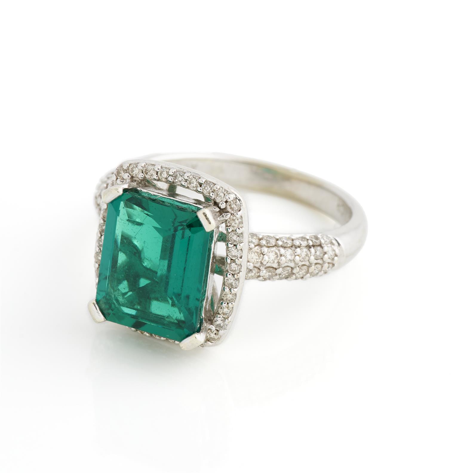 A SYNTHETIC EMERALD AND DIAMOND RING IN 9CT WHITE GOLD, THE SYNTHETIC EMERALD WEIGHING 2.00CTS, THE DIAMONDS TOTALLING 0.21CTS, SIZE K, 4.3GMS