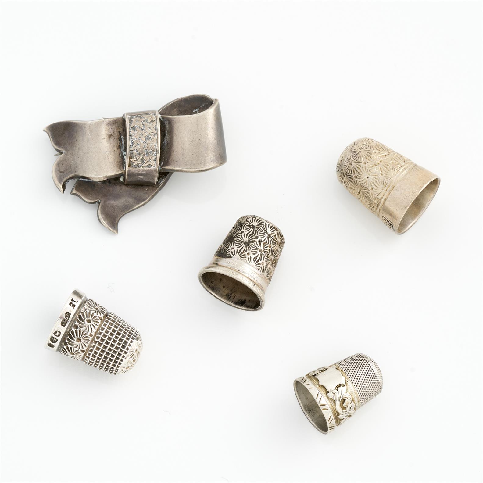 AN ANTIQUE BROOCH IN STERLING SILVER, TOGETHER WITH A COLLECTION OF FOUR THIMBLES IN STERLING SILVER, CHESTER HALLMARKS CIRCA 1896