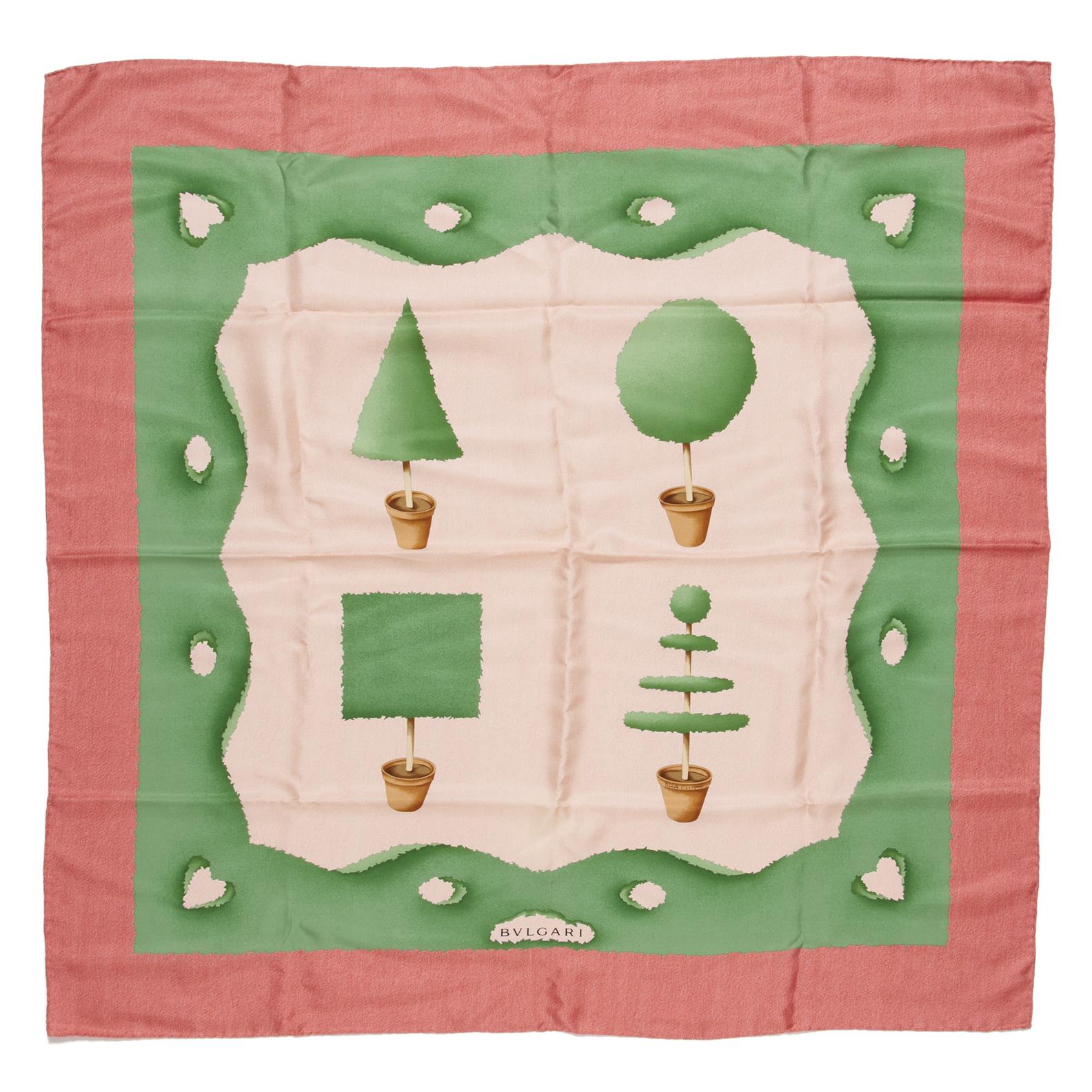 BULGARI, A TREE MOTIF SCARF STYLED IN GREEN AND PINK TONAL SILK, 85 X 85CM, ACCOMPANIED BY A BOX