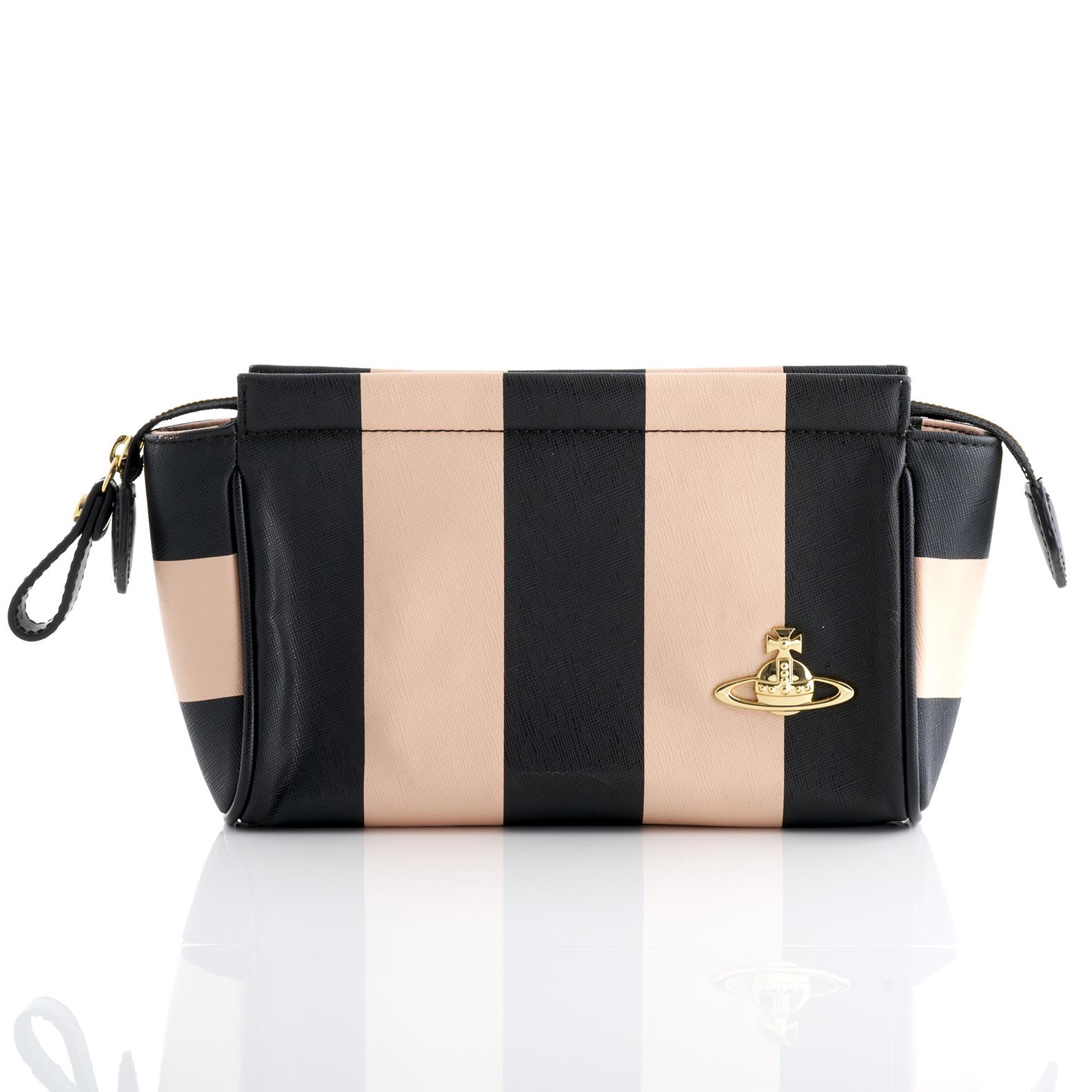 Styled in pale pink and black striped coated canvas, 15 x 27 x 5 cm, accompanied by removable strap.