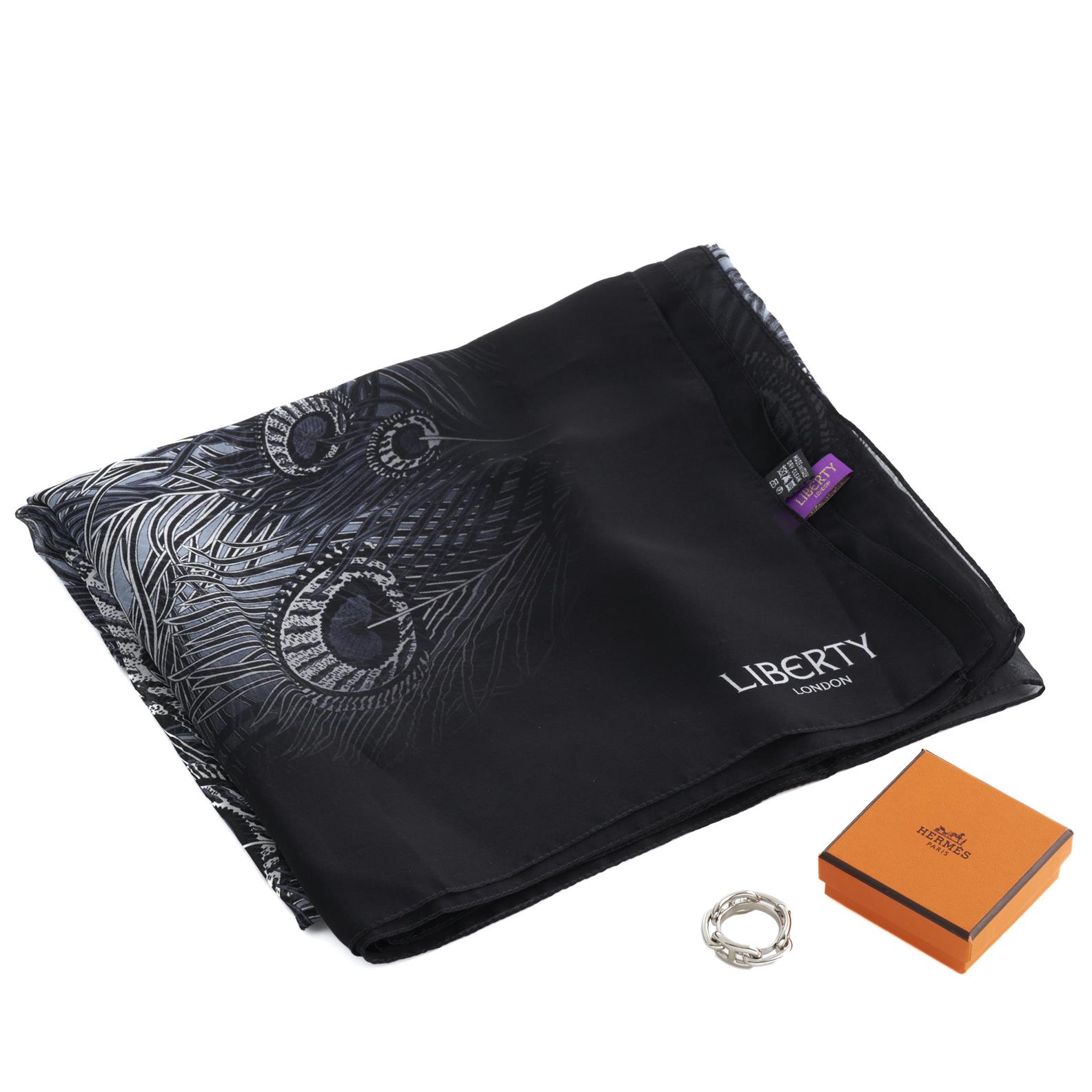 LIBERTY AND HERMES, A LIBERTY SCARF STYLED IN PEACOCK MOTIF BLACK AND TONAL SILK, TOGETHER WITH AN HERMES SCARF RING STYLED IN SILVER TONE METAL, EACH ACCOMPANIED BY A BOX