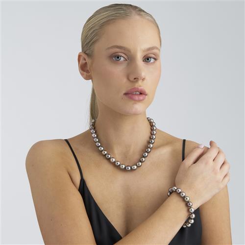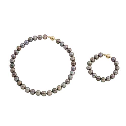 Comprising: a necklace composed of round South Sea pearls of a medium grey hue measuring approximately 11.0 - 11.8mm, completed by a ball clasp; the bracelet en suite, necklace length approximately 430mm, bracelet,180mm.