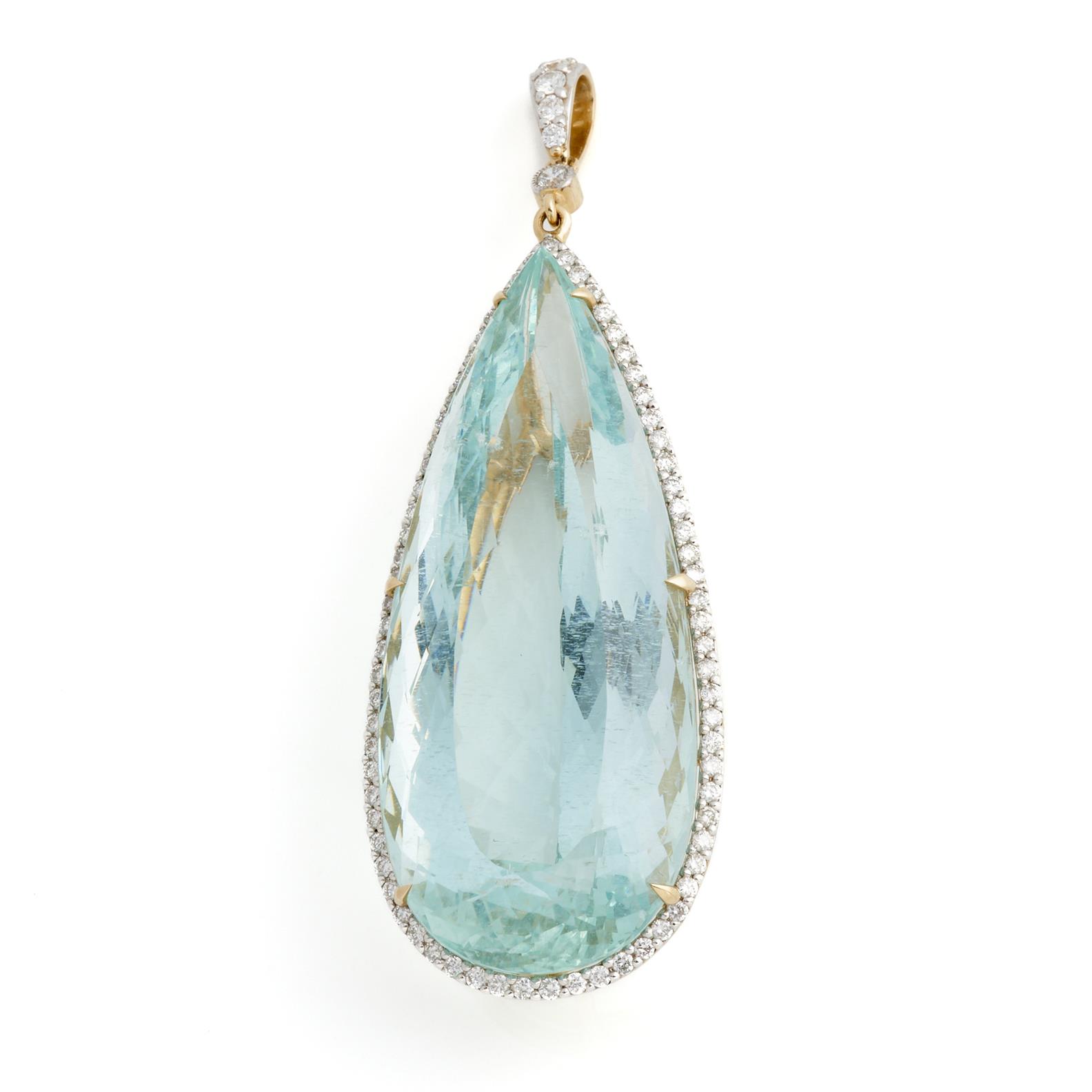 AN AQUAMARINE AND DIAMOND PENDANT IN 14CT GOLD, THE AQUAMARINE WEIGHING 80.48CTS, WITH DIAMONDS TOTALLING 0.98CTS, LENGTH 65MM