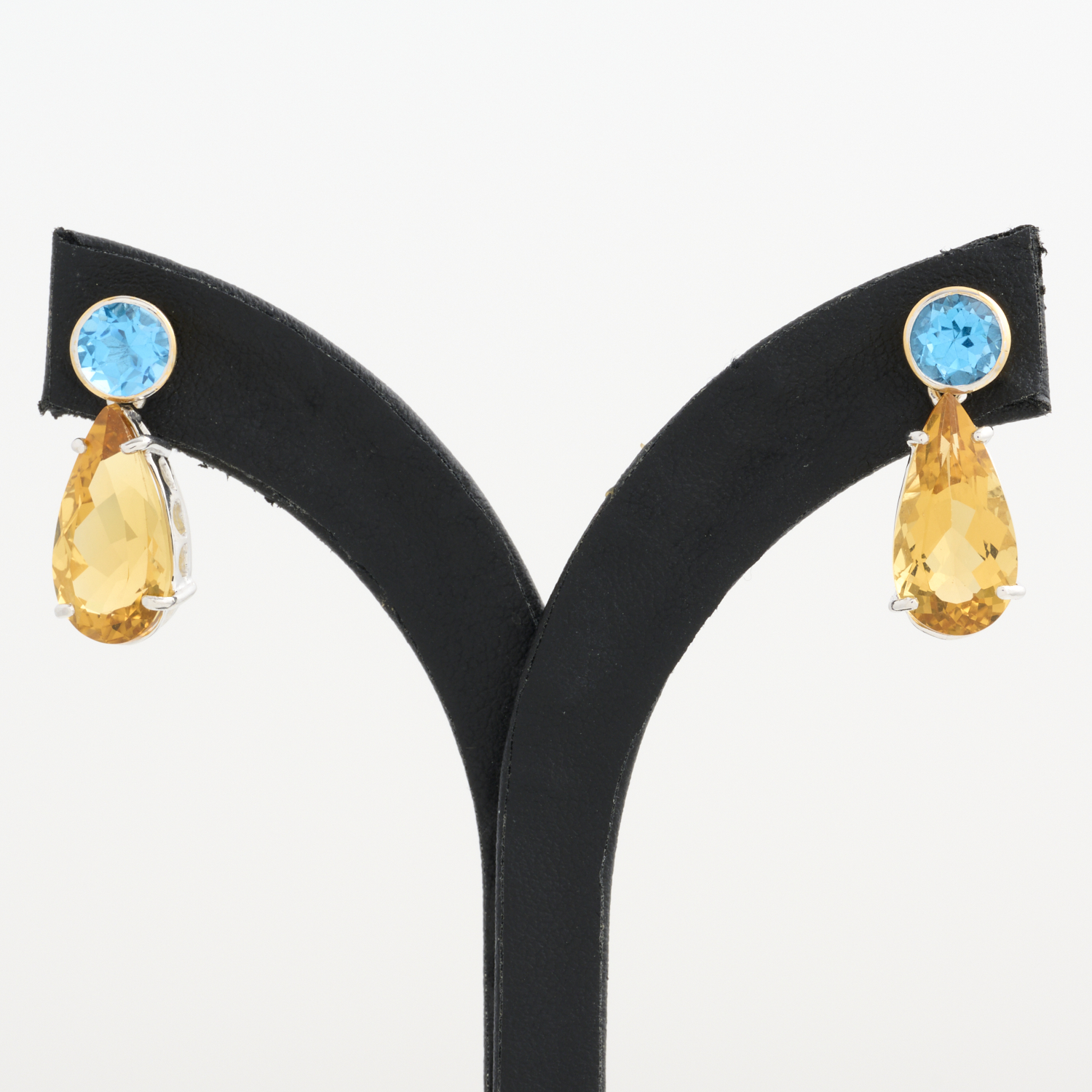 A PAIR OF GOLDEN BERYL AND TOPAZ EARRINGS IN 18CT TWO TONE GOLD, THE BERYL TOTALLING 11.26CTS, TO POST AND BUTTERFLY FITTINGS, 26MM