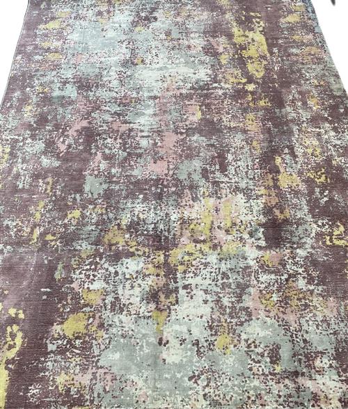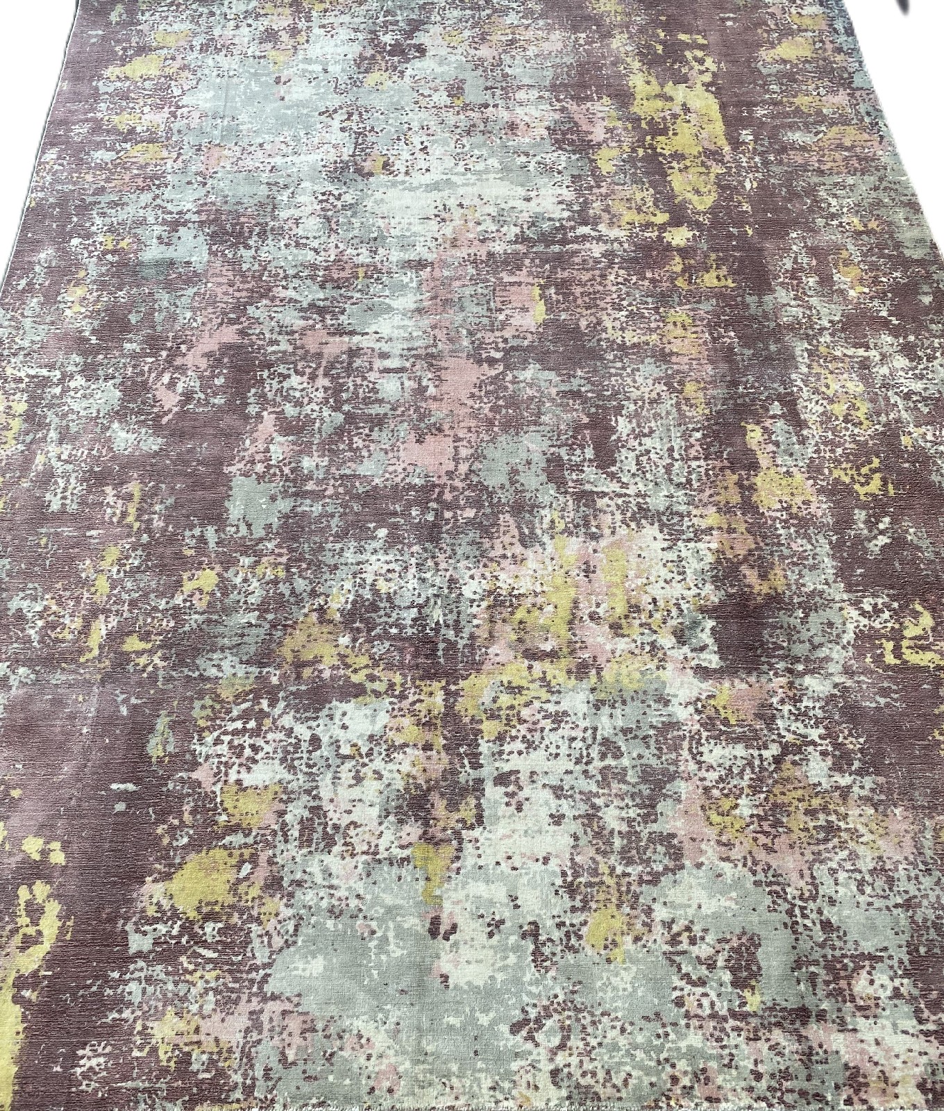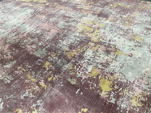 A LARGE NEW MODERN WOOL RUG, HANDLOOM WEAVE WITH AN ABSTRACT DESIGN IN SHADES OF GREY, CREAM, LILAC, PINK AND SAFFRON. IN EXCELLENT CONDITION. ORIGIN: AGRA ( 399 X 298 CM)(PLEASE NOTE THERE MAY BE SOME COLOUR VARIATION FROM PHOTOGRAPH)