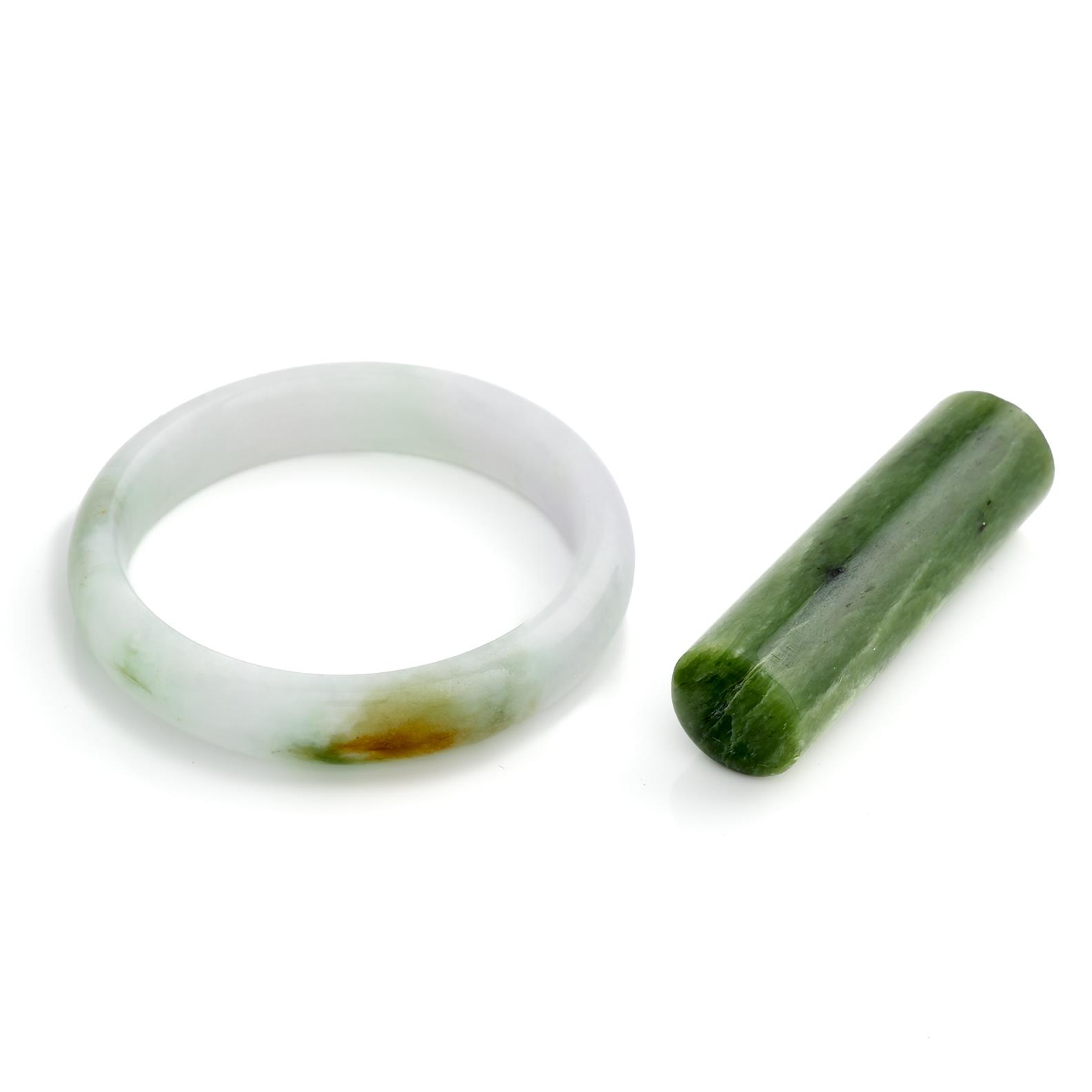 A JADEITE BANGLE, INTERIOR DIAMETER 60MM, TOGETHER WITH A BLACK JADE CYLINDER, 60 X 19MM