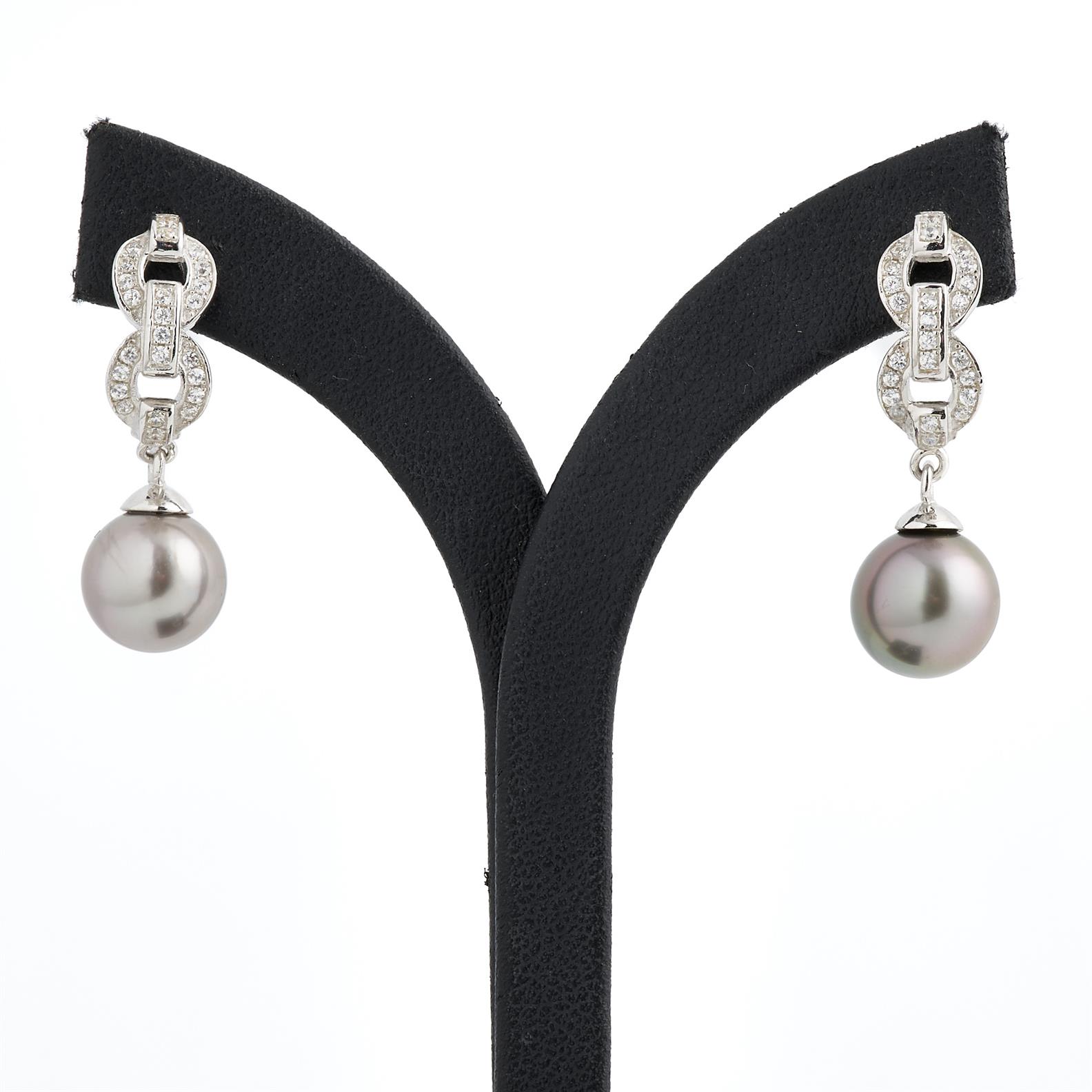 A PAIR OF TAHITIAN PEARL AND CUBIC ZIRCONIA EARRINGS IN STERLING SILVER, THE PEARLS MEASURING 9.5MM
