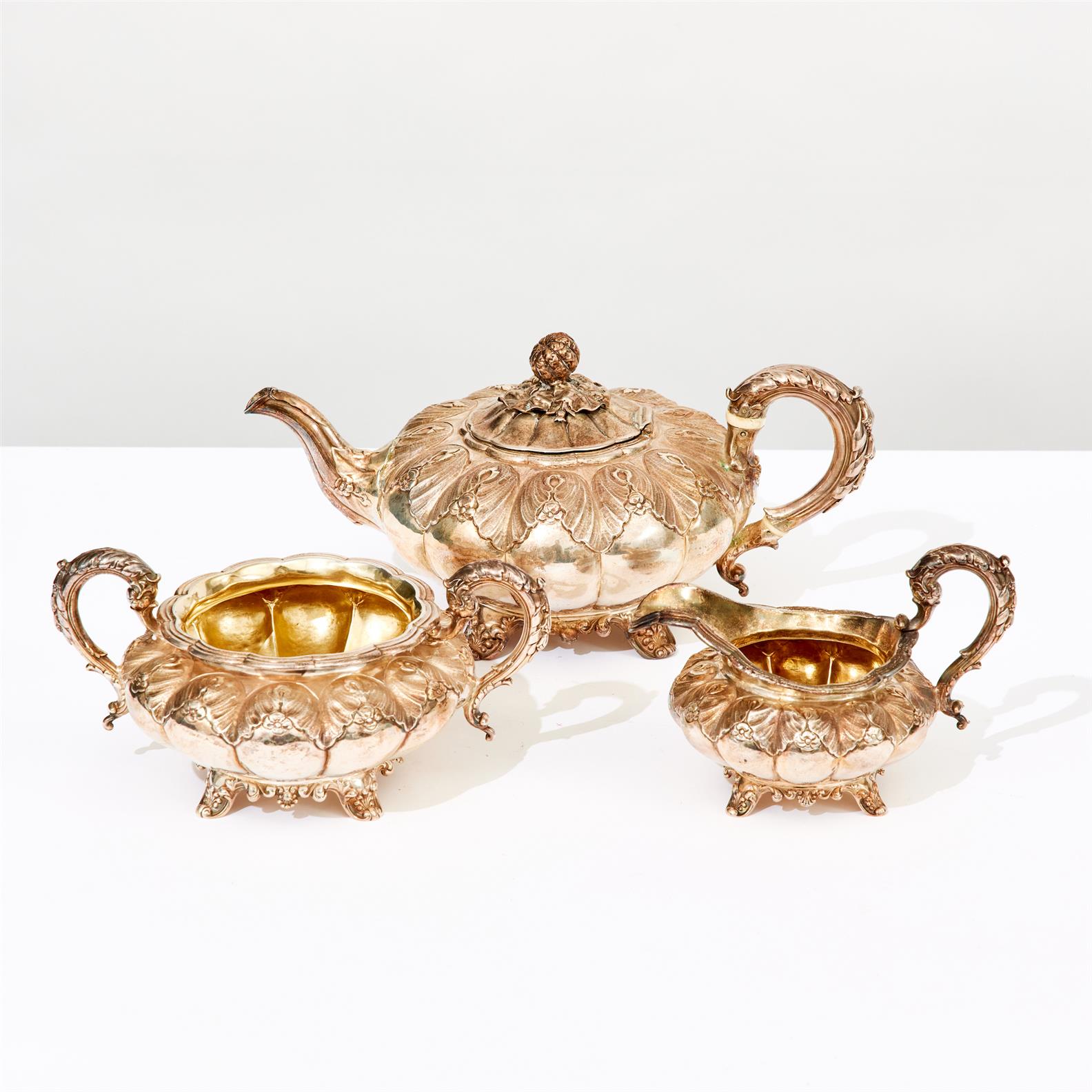 A GEORGE IV SILVER THREE PIECE TEA SET, LONDON 1830, MAKERS' MARK OF EDWARD, EDWARD JNR, JOHN & WILLIAM BARNARD, MELON SHAPED WITH CHASED FOLIAGE