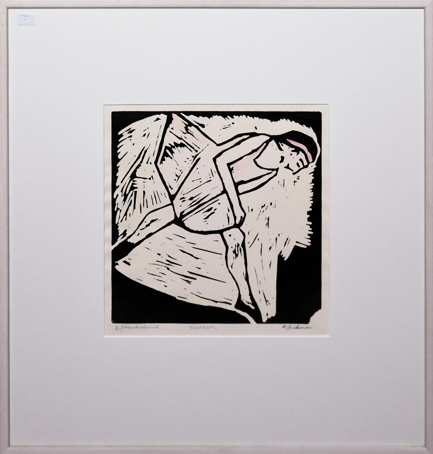 HANDCOLOURED LINOCUT, 33 X 32CM, FRAMED: 65 X 62CM