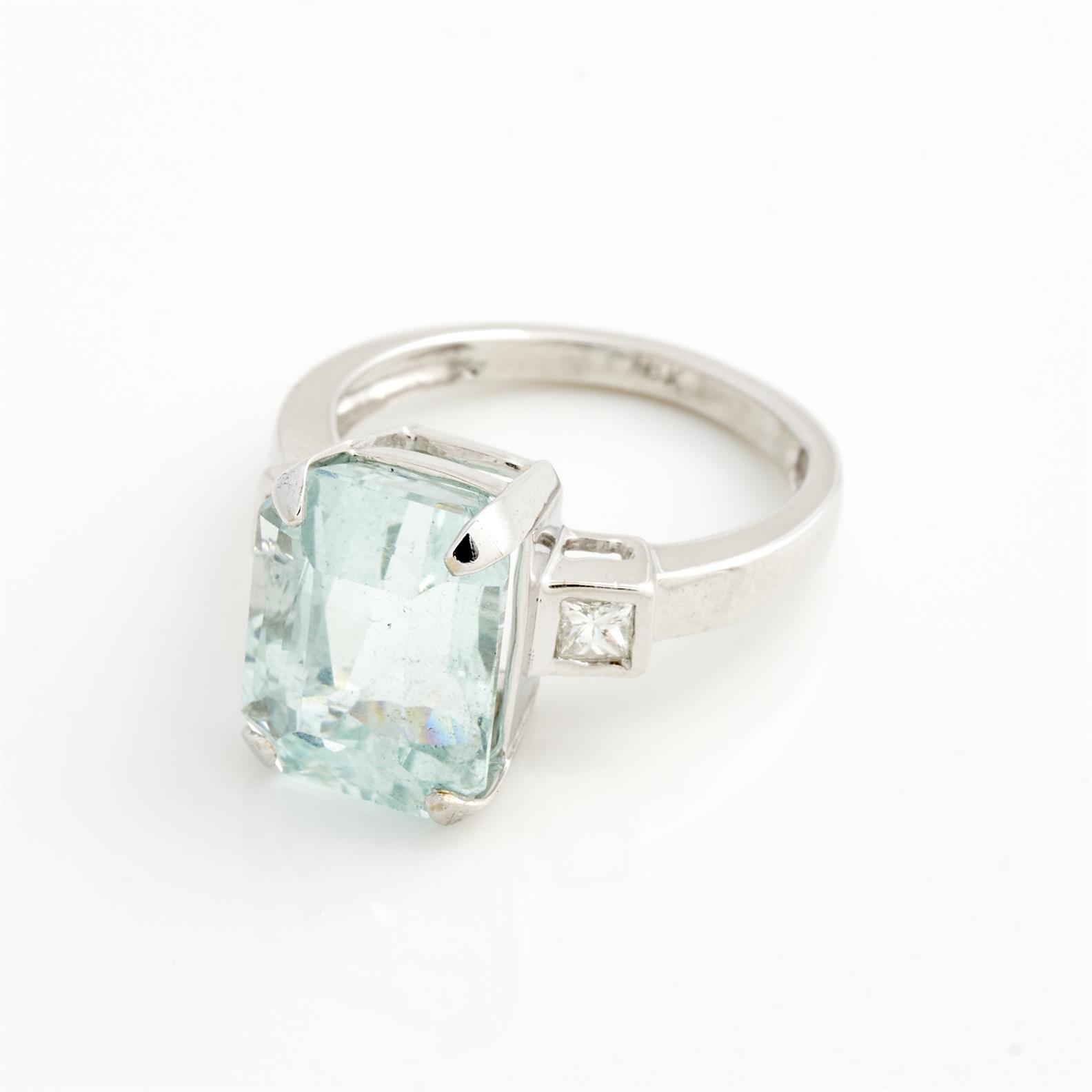AN AQUAMARINE AND DIAMOND RING IN 18CT WHITE GOLD, THE AQUAMARINE WEIGHING 7.95CTS, WITH DIAMONDS TOTALLING 0.34CTS, SIZE O