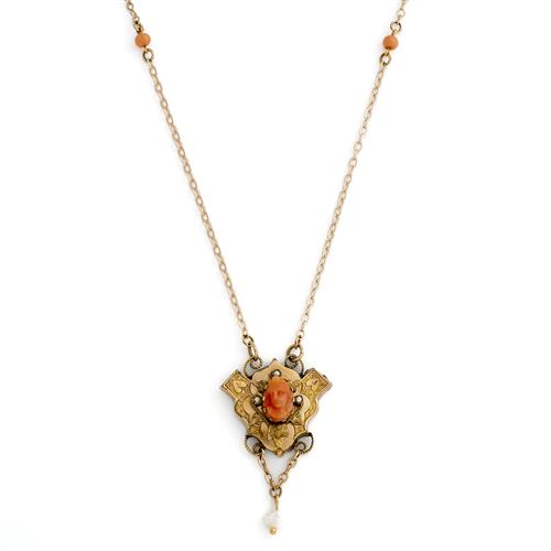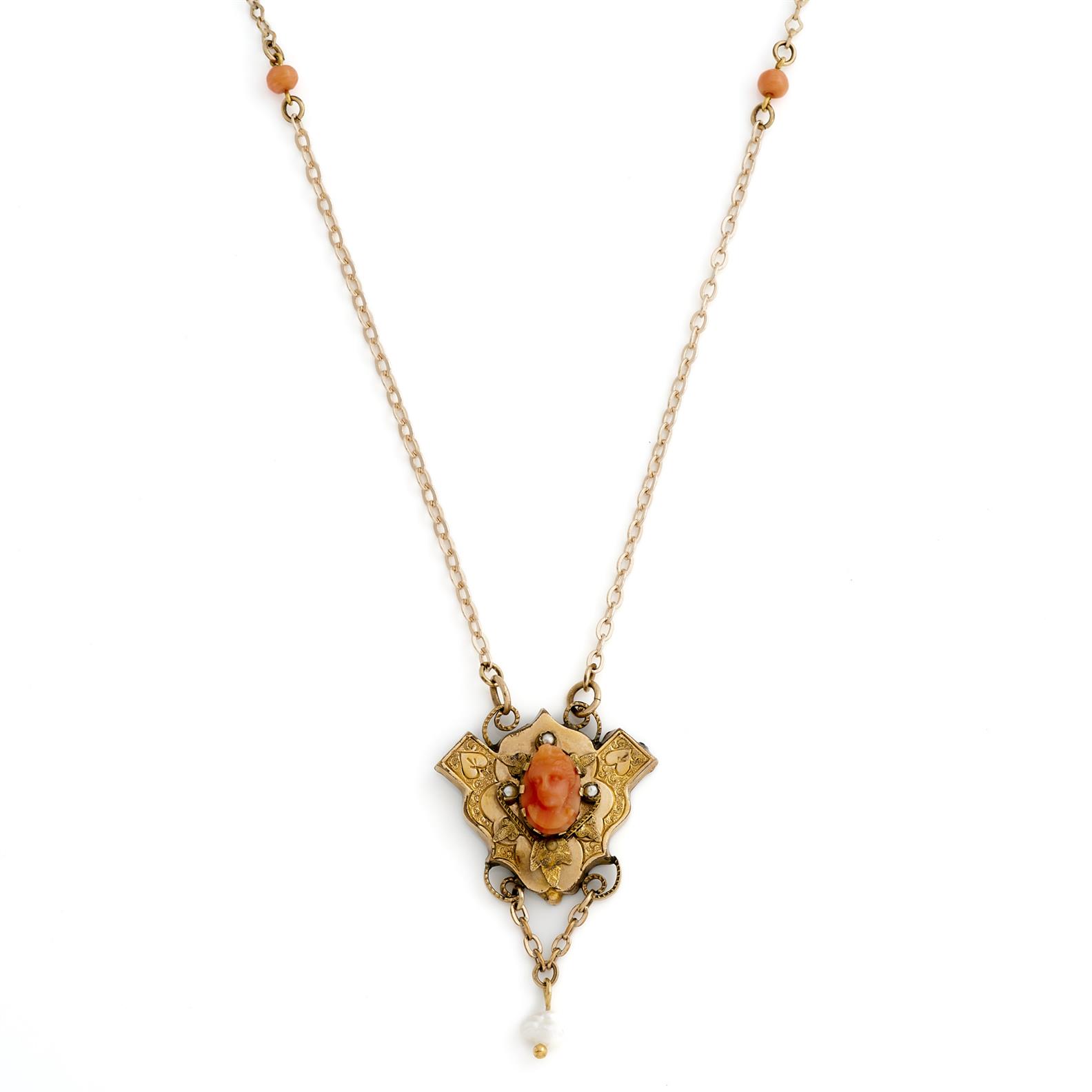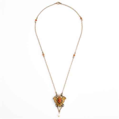 AN ANTIQUE CORAL AND PEARL PENDANT NECKLACE IN GOLD PLATE, 470MM