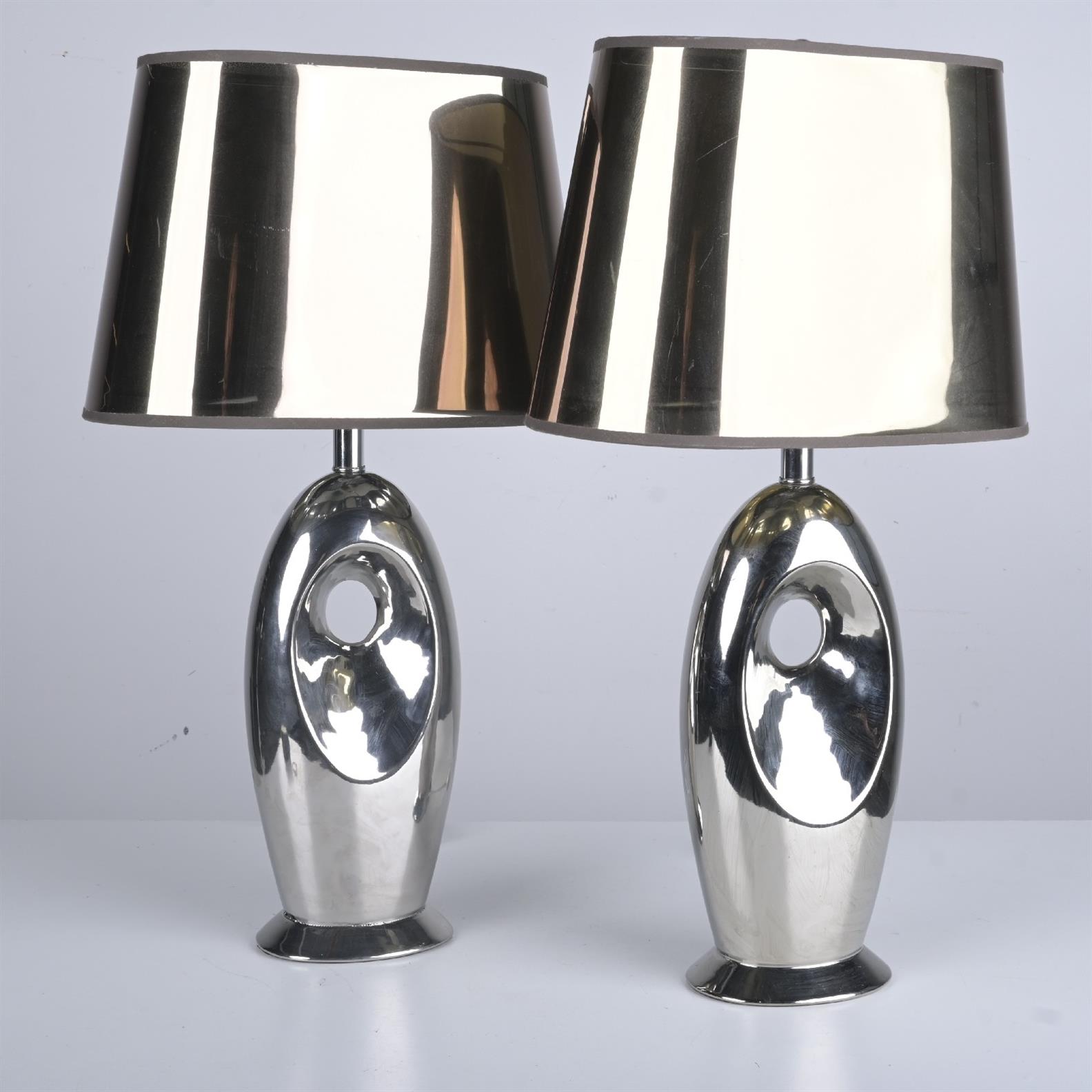 A PAIR OF MODERN SILVER TABLE LAMPS WITH SHADES (71H X 41W CM)