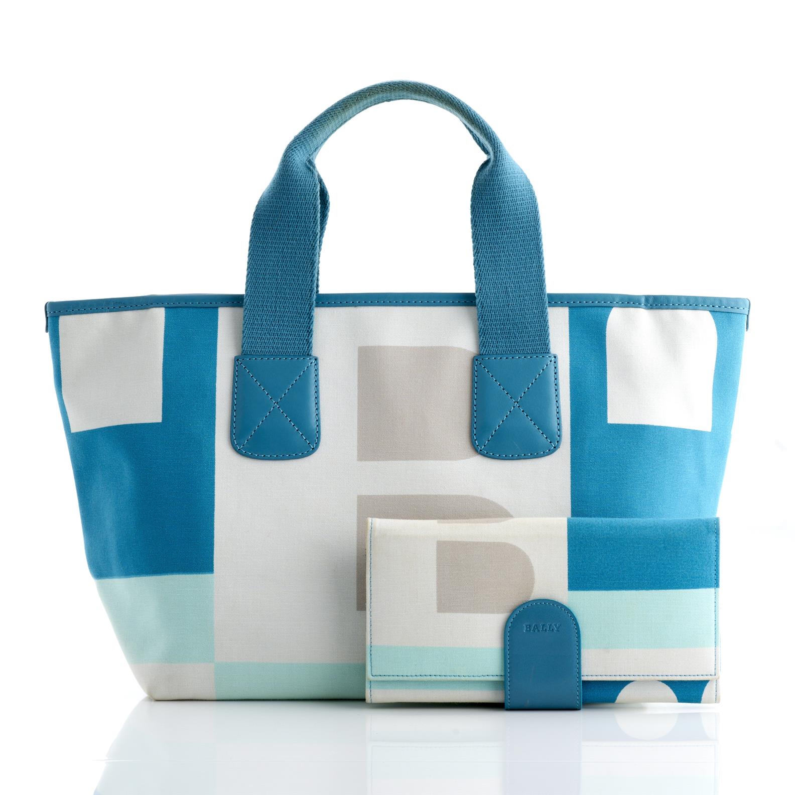 BALLY, A HANDBAG AND WALLET, STYLED IN BLUE AND TONAL FABRIC, WITH BLUE LEATHER TRIM, THE BAG MEASURING 24 X 41 X 18CM, WITH WALLET MEASURING 11 X 20 X 2CM, ACCOMPANIED BY A DUSTBAG