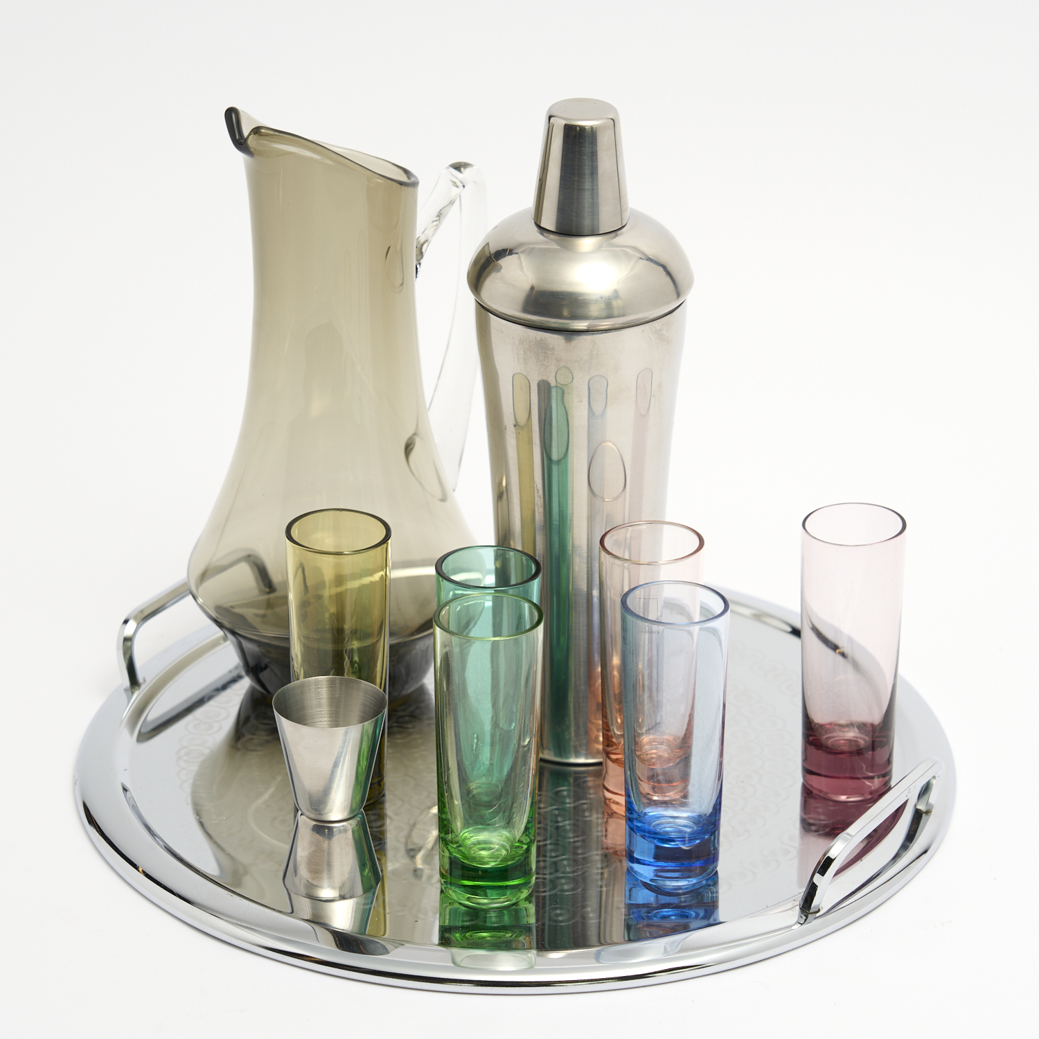 AN ASSEMBLED NINE PIECE COCKTAIL SET INCLUDING HARLEQUIN SHOT GLASSES, STAINLESS STEEL COCKTAIL SHAKER AND GALLERY TRAY H.25CM (TALLEST, LEONARD JOEL DELIVERY SIZE: MEDIUM