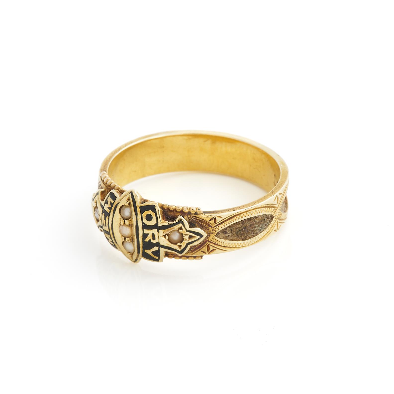 AN ENAMEL AND SEED PEARL MOURNING RING IN 15CT GOLD, CHESTER HALLMARKS, SIZE M, 2.4GMS
