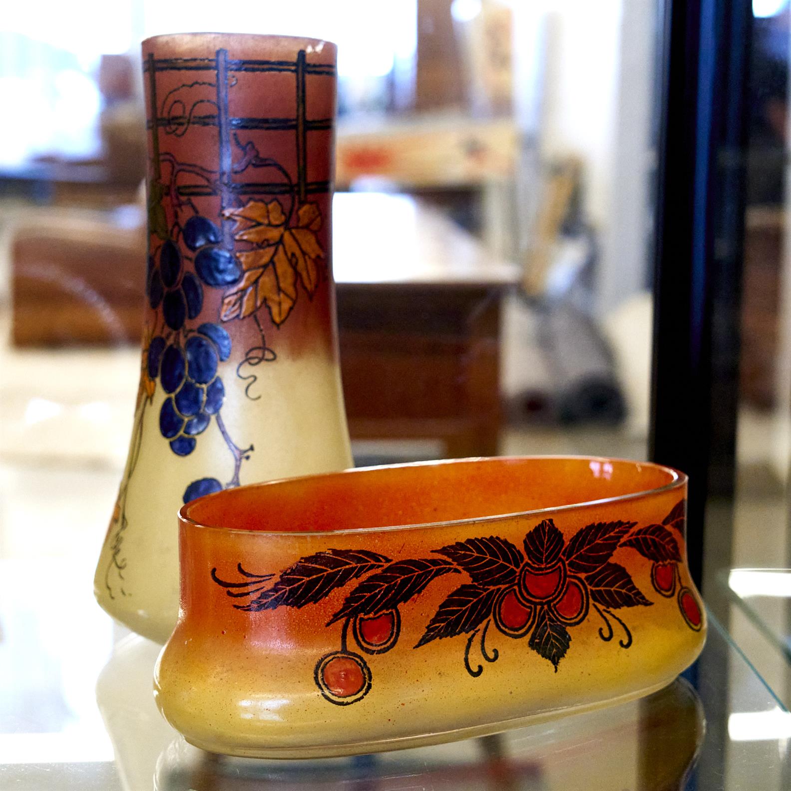 A PAIRED ORANGE TO YELLOW ART DECO GLASS VASE AND CENTRE PIECE FRUIT BOWL, BOTH SIGNED 'LEG' WITH ENAMEL DECORATION H.28CM
