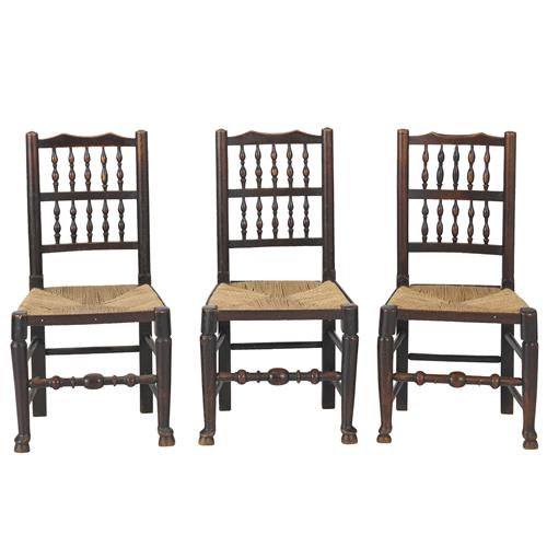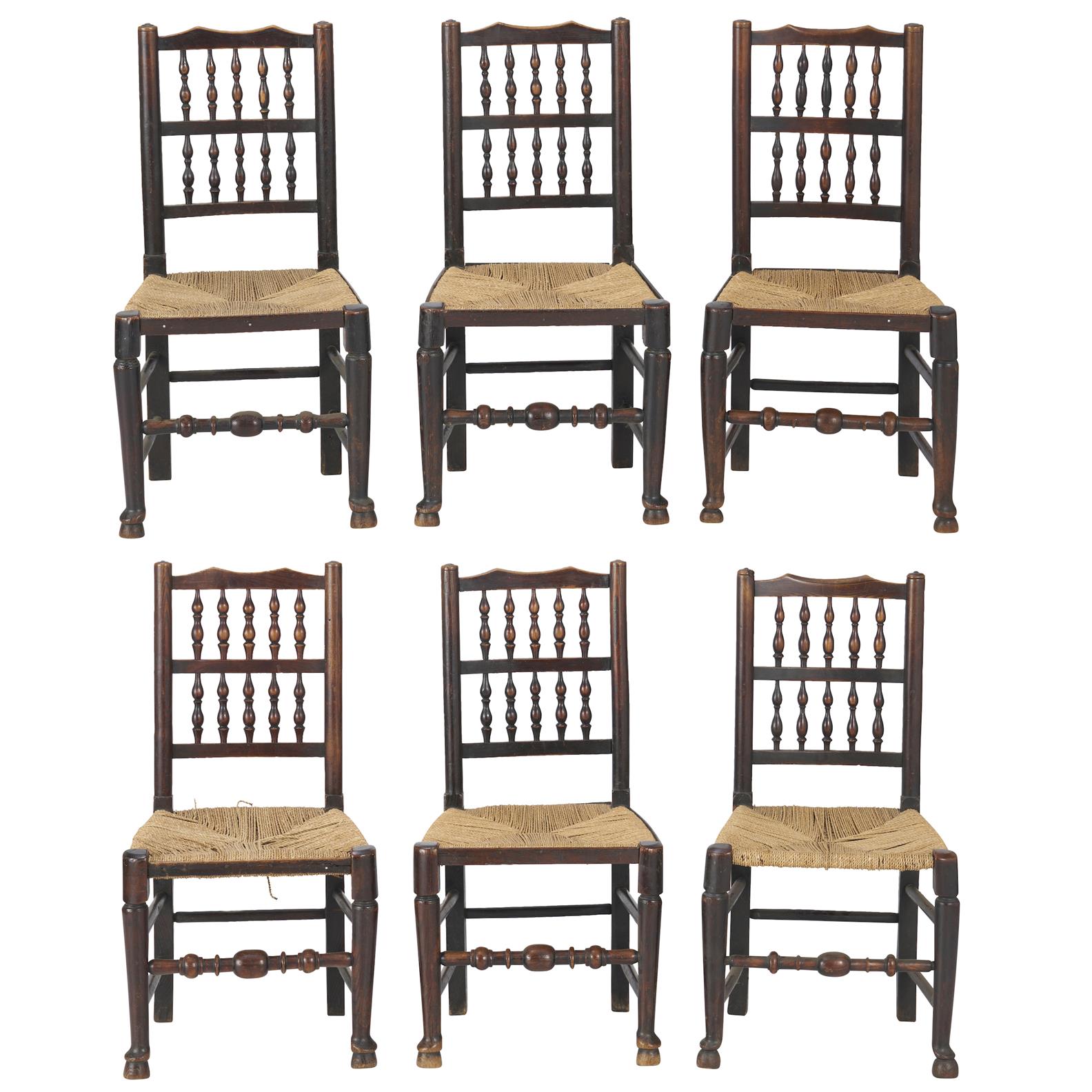 A SET OF SIX ANTIQUE LANCASHIRE ELM SPINDLE-BACK SIDE CHAIRS