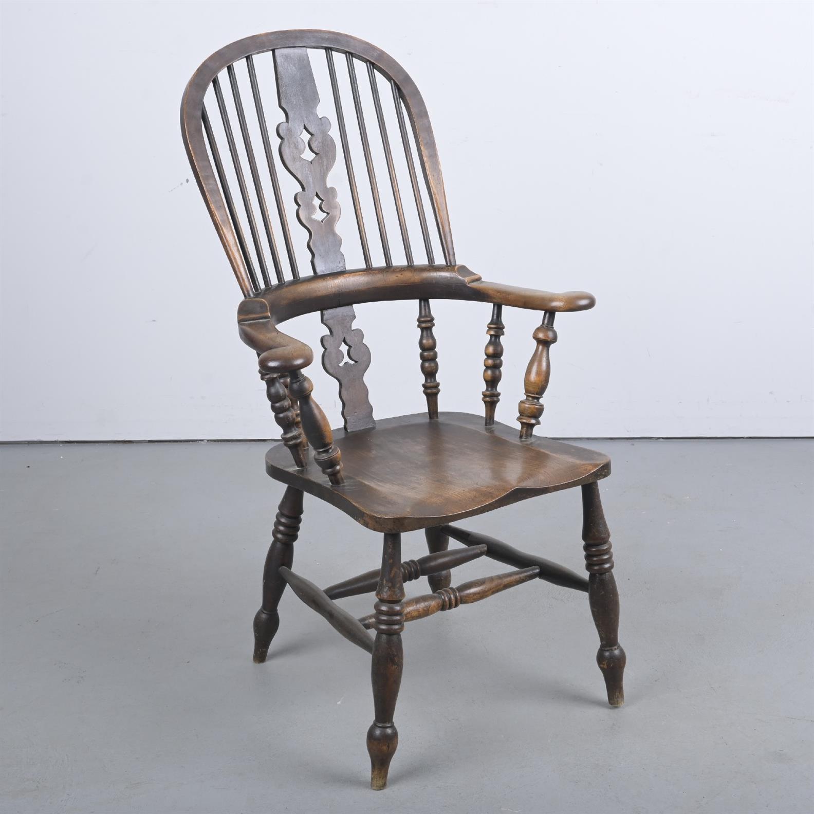 AN ANTIQUE ELM & ASH WINDSOR CHAIR (116H X 67W X 52D CM)