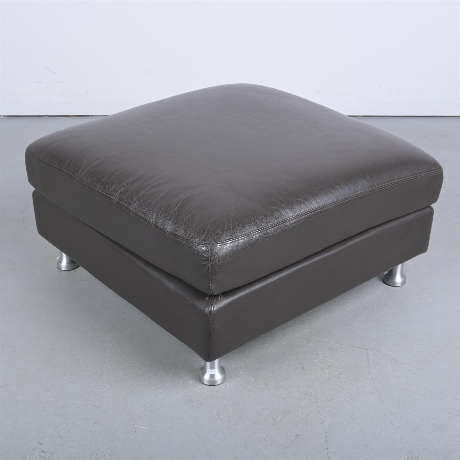 A LEATHER OTTOMAN, ON CHROME FEET FOR KING FURNITURE (42H X 80W X 80D CM)