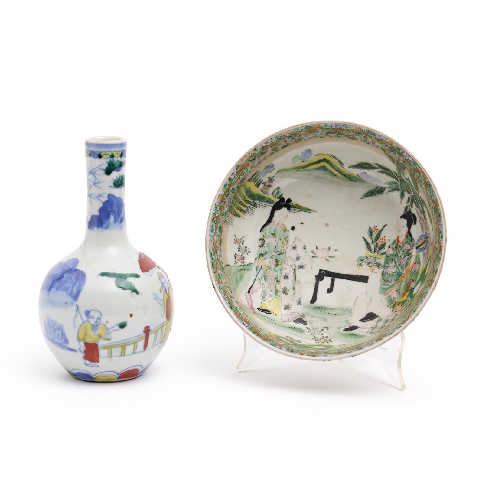 A CHINESE 18TH CENTURY EXPORT FAMILLE VERTE BOWL TOGETHER WITH AN EARLY 2OTH CENTURY BOTTLE VASE H.19CM LEONARD JOEL DELIVERY SIZE: MEDIUM
