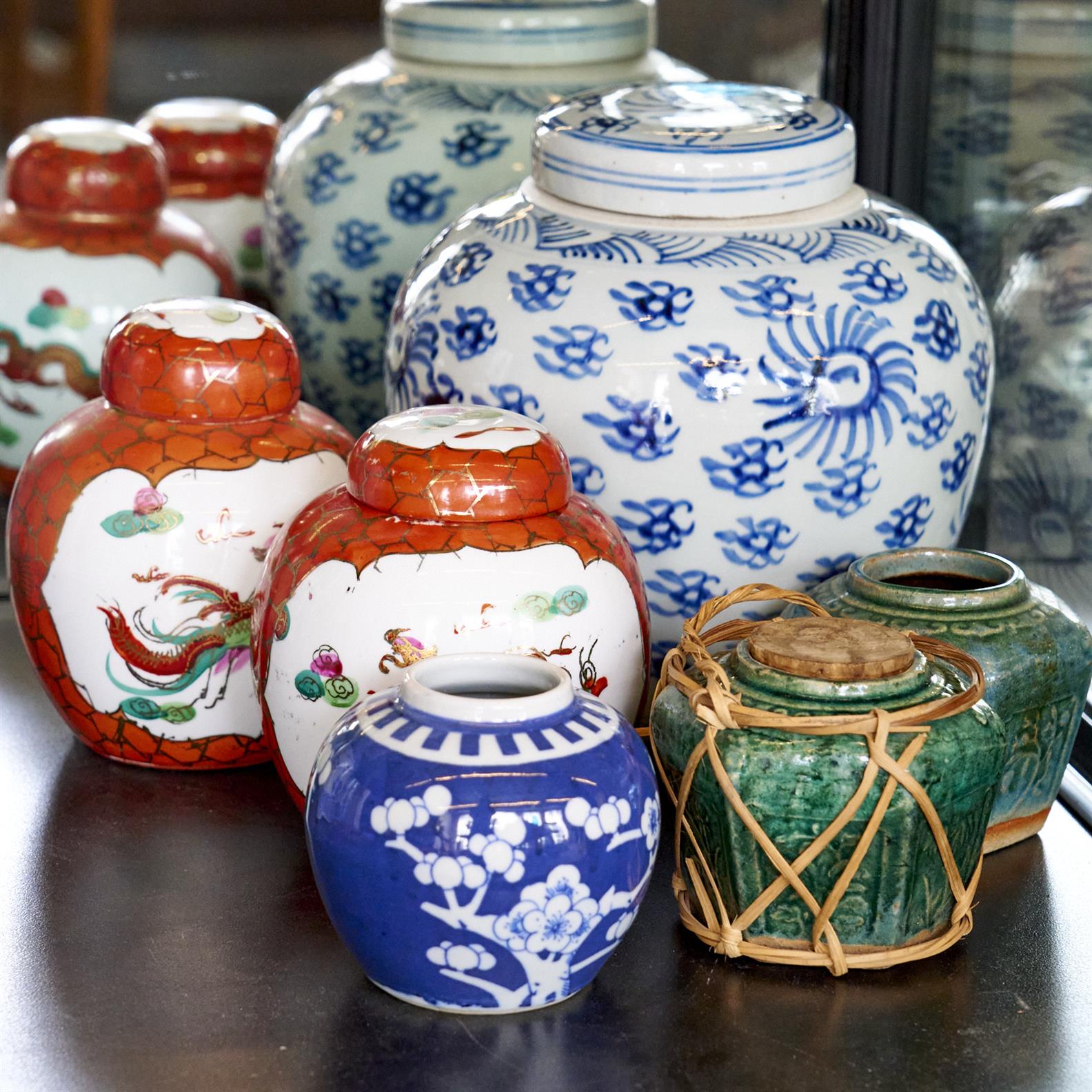 A COLLECTION OF CHINESE GINGER JARS INCLUDING A LARGE BLUE AND WHITE DECORATED WITH TWO SMALLER PAIRS H.23CM (TALLEST), LEONARD JOEL DELIVERY SIZE: LARGE