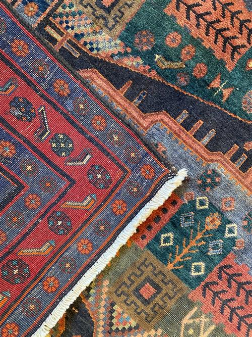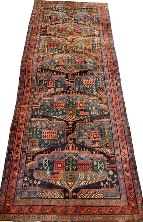 AN ANTIQUE BIDJAR HAND-SPUN WOOL ENTRANCE RUG WITH NATURAL DYES. RARE DESIGN OF REPEATING MEDALLIONS AND SEMI-MEDALLIONS CONTAINING GEOMETRIC PATTERNS AND TREE OF LIFE MOTIFS. MINOR BORDERS OF FLOWER HEADS. THE ENTIRE IN SHADES OF CHARCOAL, BLUE, EMERALD GREEN AND TERRACOTTA. PROFESSIONALLY RESTORED AND IN EXCELLENT CONDITION. ORIGIN: IRAN (392 X 157 CM) (PLEASE NOTE THERE MAY BE SOME COLOUR VARIATION FROM PHOTOGRAPH)